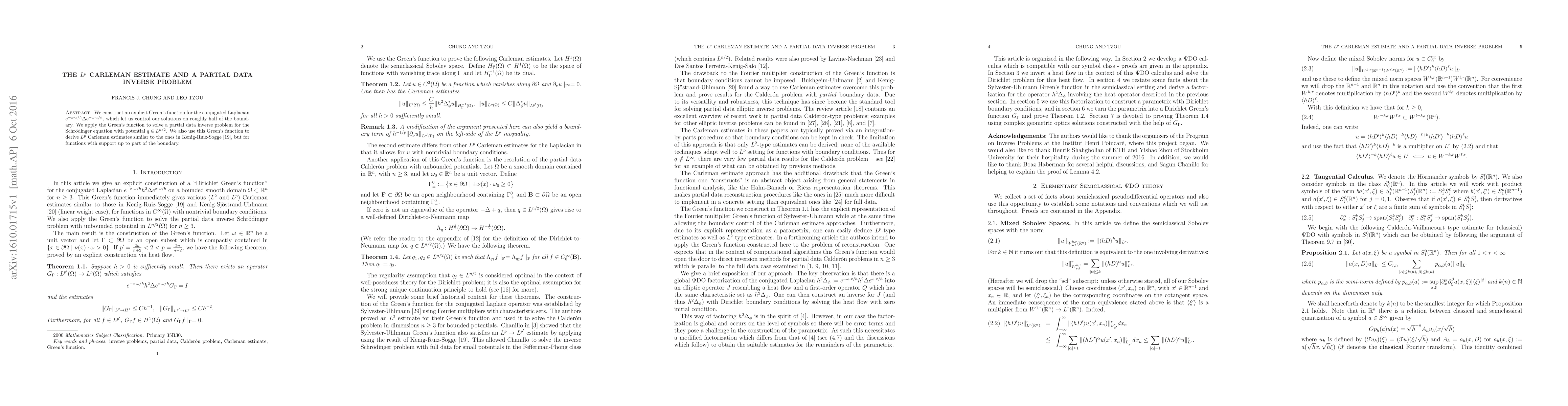 We construct an explicit Green's function for the conjugated Laplacian $e^{-\omega \cdot x/h}\Delta e^{-\omega \cdot x/h}$, which let us control our solutions on roughly half of the boundary. We apply the Green's function to solve a partial data inverse problem for the Schr\"odinger equation with potential $q \in L^{n/2}$. We also use this Green's function to derive $L^p$ Carleman estimates similar to the ones in Kenig-Ruiz-Sogge \cite{krs}, but for functions with support up to part of the boundary.