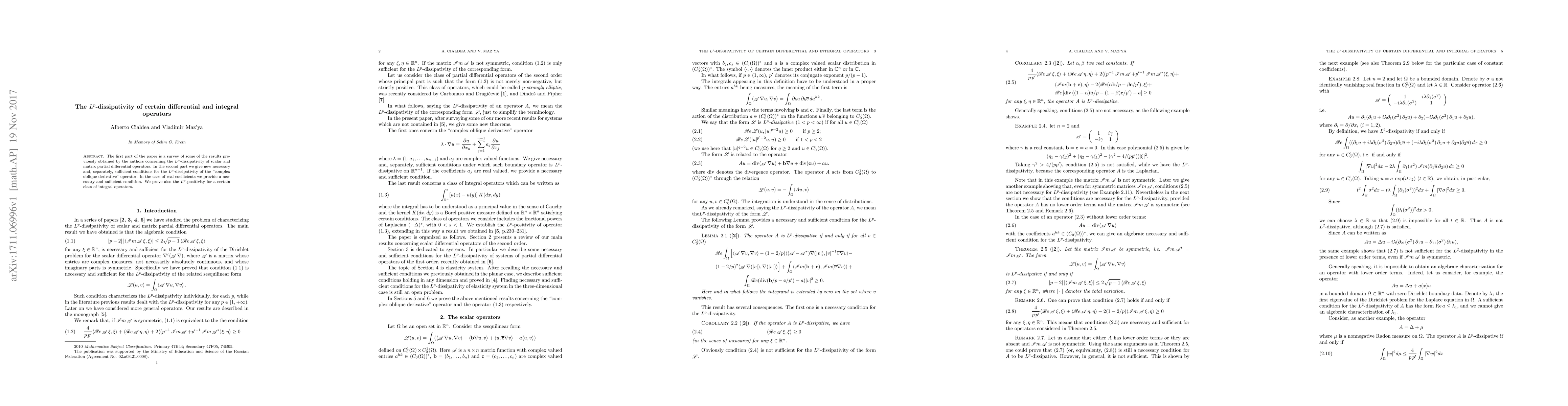 The paper investigates conditions for $L^p$-dissipativity of differential and integral operators, including a new necessary and sufficient condition for the complex oblique derivative operator.
