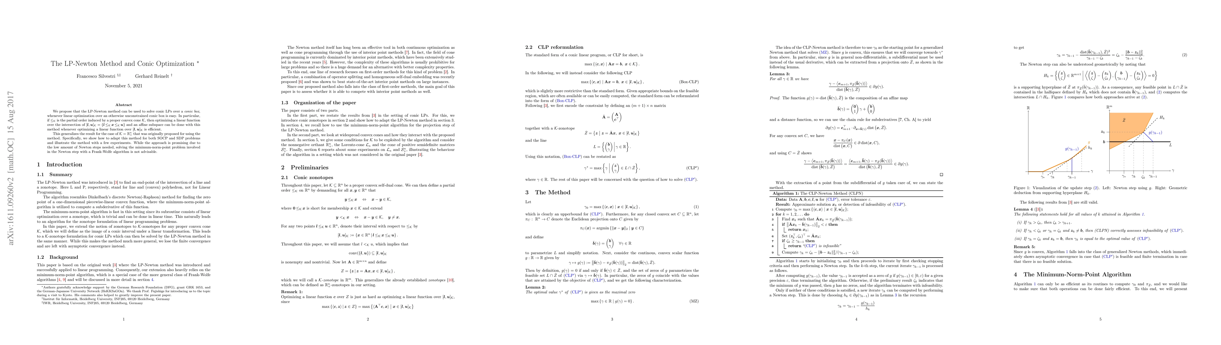 The LP-Newton method is proposed to solve conic linear programs over conic boxes efficiently, generalizing its application to SOCP and SDP problems. Although promising due to few Newton steps, using a Frank-Wolfe algorithm for the minimum-norm-point problem in the Newton step is discouraged.