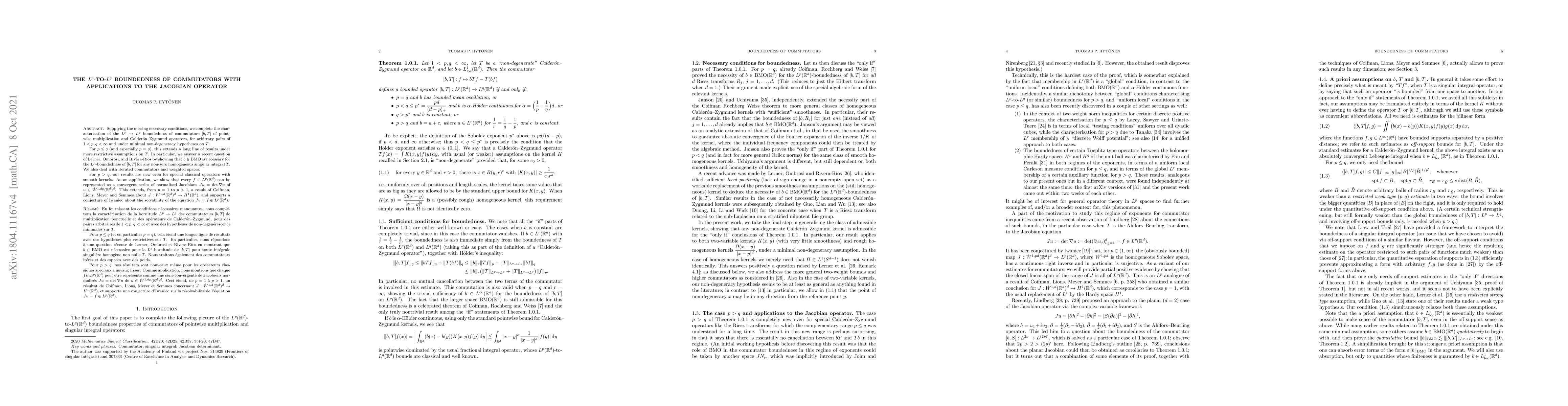 This paper completes the characterization of $L^p\to L^q$ boundedness for commutators $[b,T]$ of pointwise multiplication and Calderón-Zygmund operators, providing necessary conditions under minimal hypotheses. It resolves a question about the necessity of $b\in BMO$ for $L^p$-boundedness of $[b,T]$, extends results for $p\leq q$, and introduces new findings for $p>q$. An application shows $f\in L^p(\mathbb{R}^d)$ can be represented by a series of normalised Jacobians, supporting a conjecture on solvability.