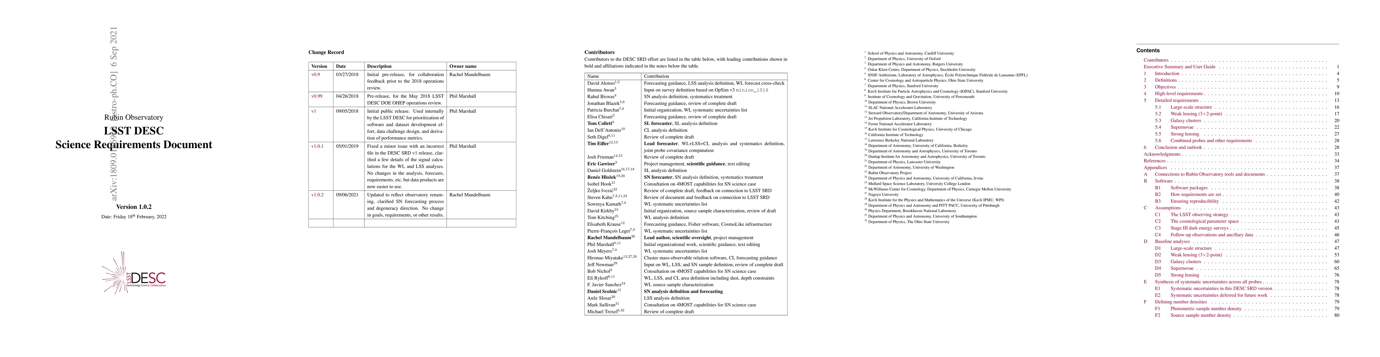 The LSST Dark Energy Science Collaboration (DESC) Science Requirements Document outlines the methodology and expectations for using five cosmological probes to achieve Stage IV dark energy analysis, detailing the requirements for analysis pipelines to manage systematic uncertainties and future updates.
