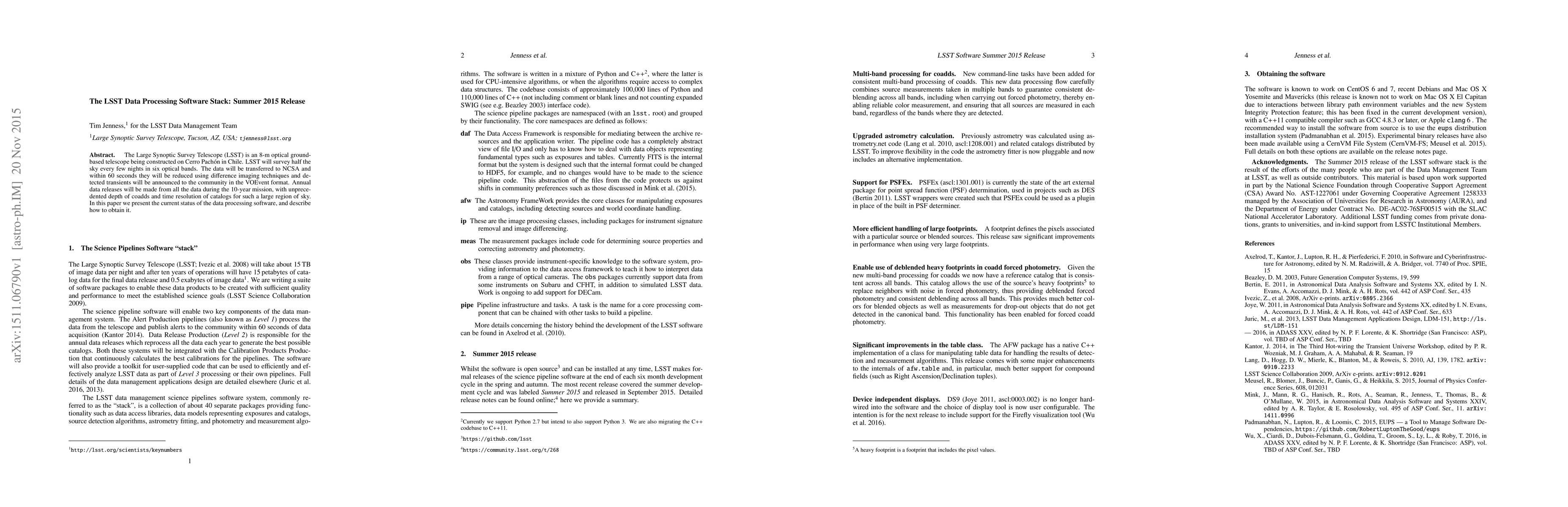 The LSST Data Processing Software Stack is designed to handle the massive data produced by the Large Synoptic Survey Telescope, with annual releases of unprecedented depth and time resolution for a 10-year mission.