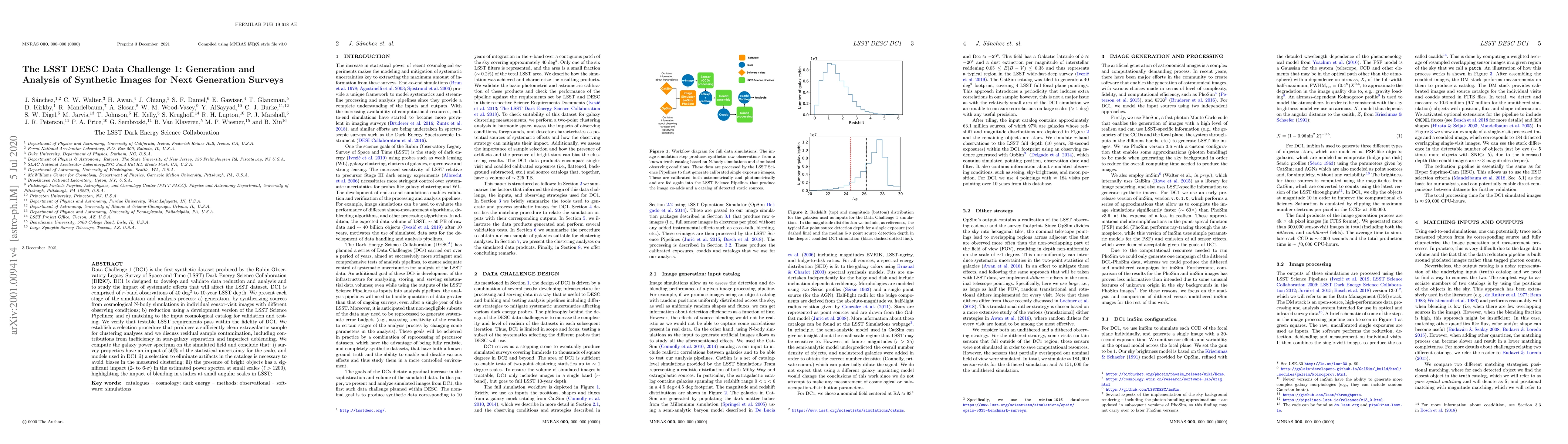 Data Challenge 1 (DC1) is the first synthetic dataset produced by the Rubin Observatory Legacy Survey of Space and Time (LSST) Dark Energy Science Collaboration (DESC). DC1 is designed to develop and validate data reduction and analysis and to study the impact of systematic effects that will affect the LSST dataset. DC1 is comprised of $r$-band observations of 40 deg$^{2}$ to 10-year LSST depth. We present each stage of the simulation and analysis process: a) generation, by synthesizing sources from cosmological N-body simulations in individual sensor-visit images with different observing conditions; b) reduction using a development version of the LSST Science Pipelines; and c) matching to the input cosmological catalog for validation and testing. We verify that testable LSST requirements pass within the fidelity of DC1. We establish a selection procedure that produces a sufficiently clean extragalactic sample for clustering analyses and we discuss residual sample contamination, including contributions from inefficiency in star-galaxy separation and imperfect deblending. We compute the galaxy power spectrum on the simulated field and conclude that: i) survey properties have an impact of 50\% of the statistical uncertainty for the scales and models used in DC1 ii) a selection to eliminate artifacts in the catalogs is necessary to avoid biases in the measured clustering; iii) the presence of bright objects has a significant impact (2- to 6-$\sigma$) in the estimated power spectra at small scales ($\ell > 1200$), highlighting the impact of blending in studies at small angular scales in LSST;