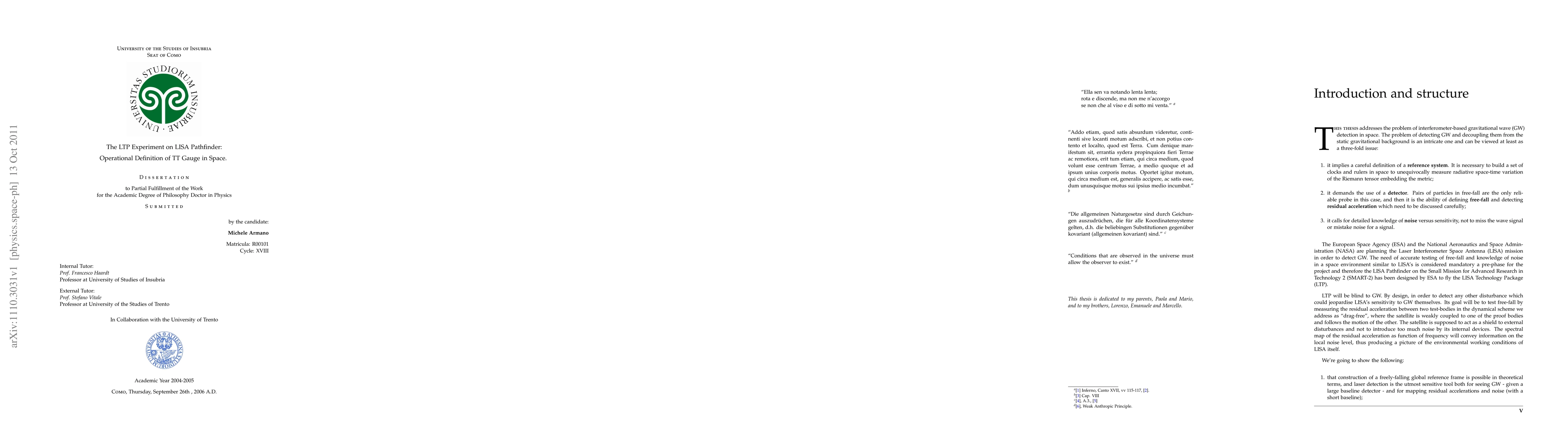The European Space Agency (ESA) and the National Aeronautics and Space Administration (NASA) are planning the Laser Interferometer Space Antenna (LISA) mission in order to detect GW. The need of accurate testing of free-fall and knowledge of noise in a space environment similar to LISA's is considered mandatory a pre-phase for the project. Therefore the LISA Pathfinder mission has been designed by ESA to fly the LISA Technology Package (LTP), aiming at testing free-fall by measuring the residual acceleration between two test-bodies in the dynamical scheme we address as "drag-free". The spectral map of the residual acceleration as function of frequency will convey information on the local noise level, thus producing a picture of the environmental working conditions for LISA itself. The thesis contains abundant material on the problem of compensating static gravity, the development of a theory of orthogonalization of reference and cross-talk for the LTP experiment. The construction of the laser detection procedure starting from GR and differential geometry arguments is carried on. Effort was put in pointing out the physical motivations for the choices made in several other papers by the author and colleagues. In this perspective the thesis is meant as a summary tool for the LTP collaboration. In the second part of the thesis we summarize our contributions for a measurement of G onboard LTP and review on possible tests of fundamental physics the mission might embody. A wide part of the thesis is now part of the LTP Operation Master Plan, describing the real science and operations onboard LISA Pathfinder. This thesis was defended on September 26th, 2006 at the University of Como, Italy.
