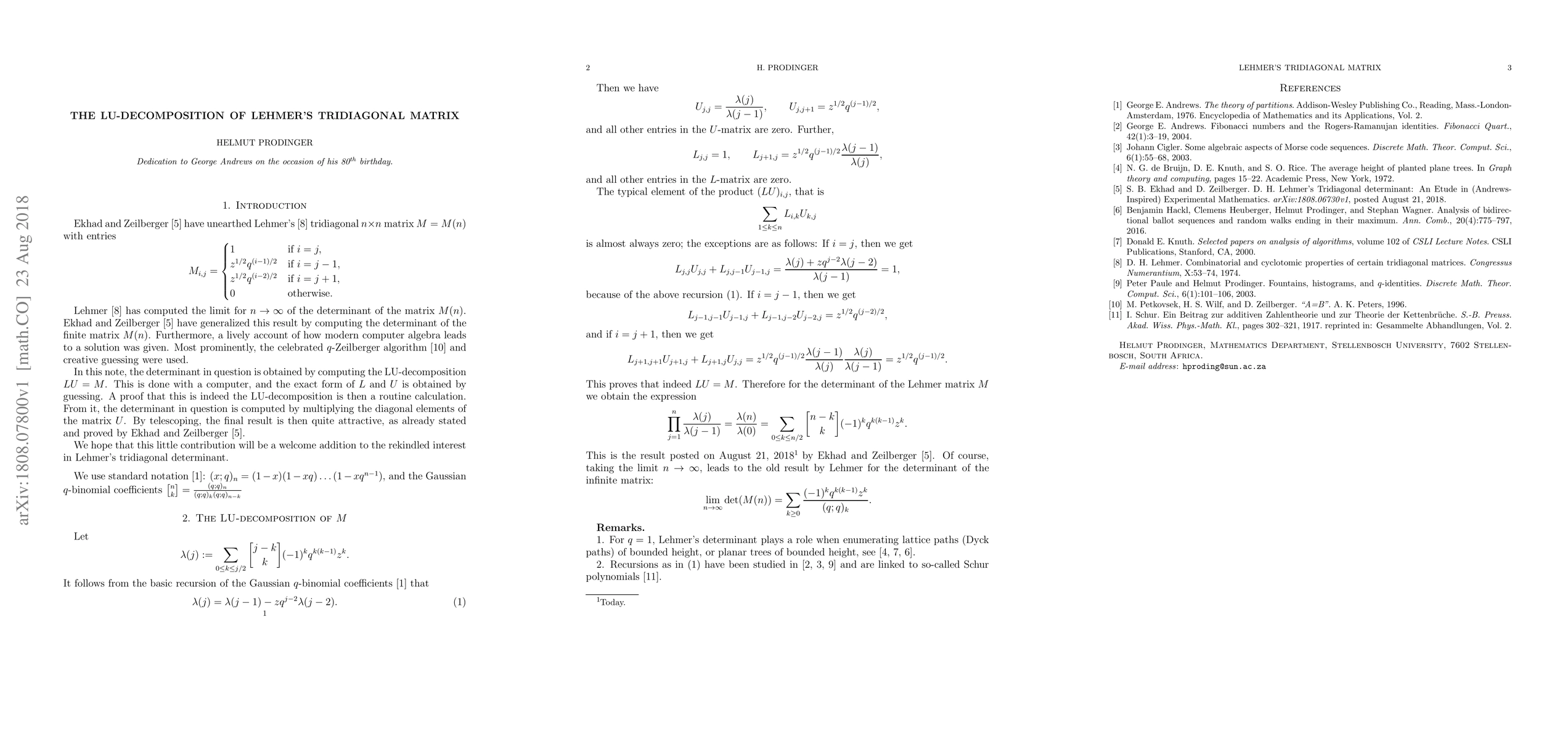Summary: This paper explores the LU-decomposition of Lehmer's tridiagonal matrix, initially hypothesized and subsequently proven, which facilitates the evaluation of the matrix's determinant. The findings provide valuable insights into matrix decomposition techniques.