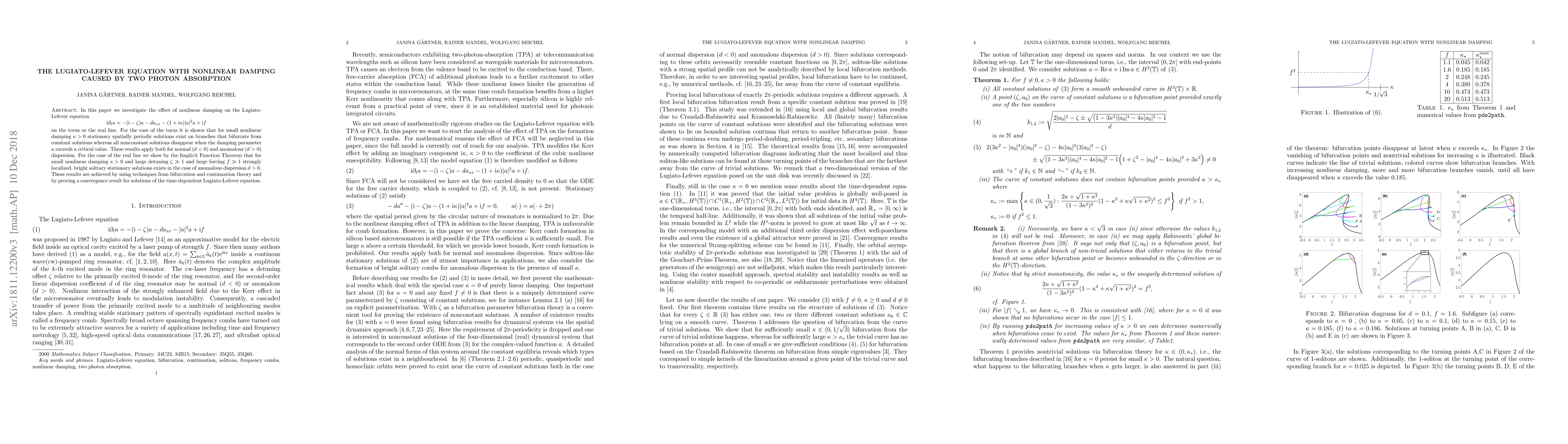 This paper explores the impact of nonlinear damping due to two-photon absorption on the Lugiato-Lefever equation, revealing the existence of spatially periodic and solitary wave solutions under specific conditions. For the torus, periodic solutions bifurcate from constant ones for small damping, while for the real line, localized bright solitons emerge under large detuning and forcing.
