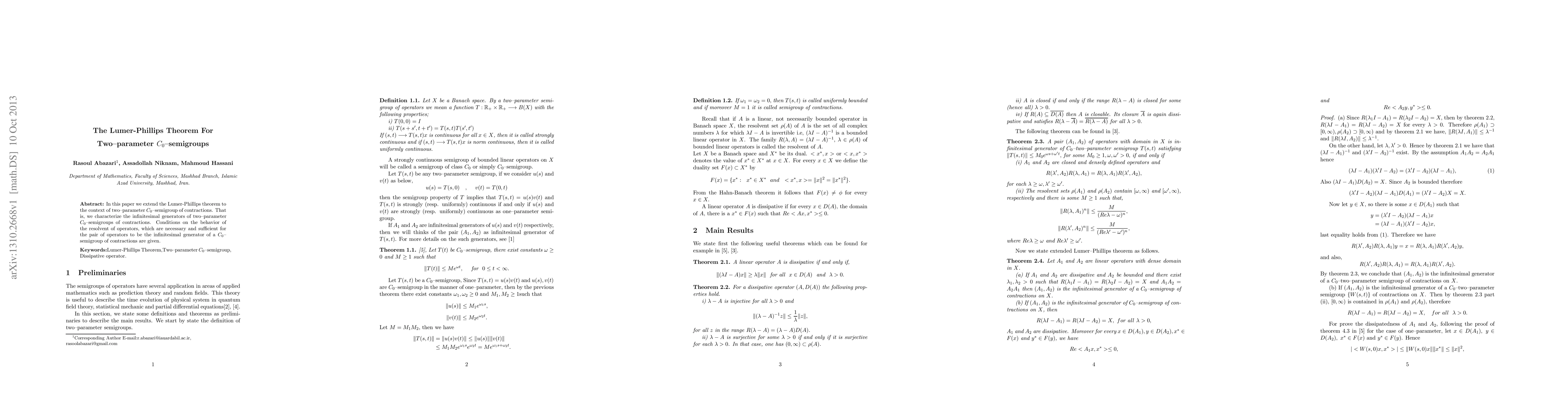 This paper extends the Lumer-Phillips theorem to two-parameter $C_0$-semigroups of contractions, providing conditions on operator resolvents for them to be infinitesimal generators of such semigroups. The study characterizes the necessary and sufficient behavior of resolvents for operator pairs.