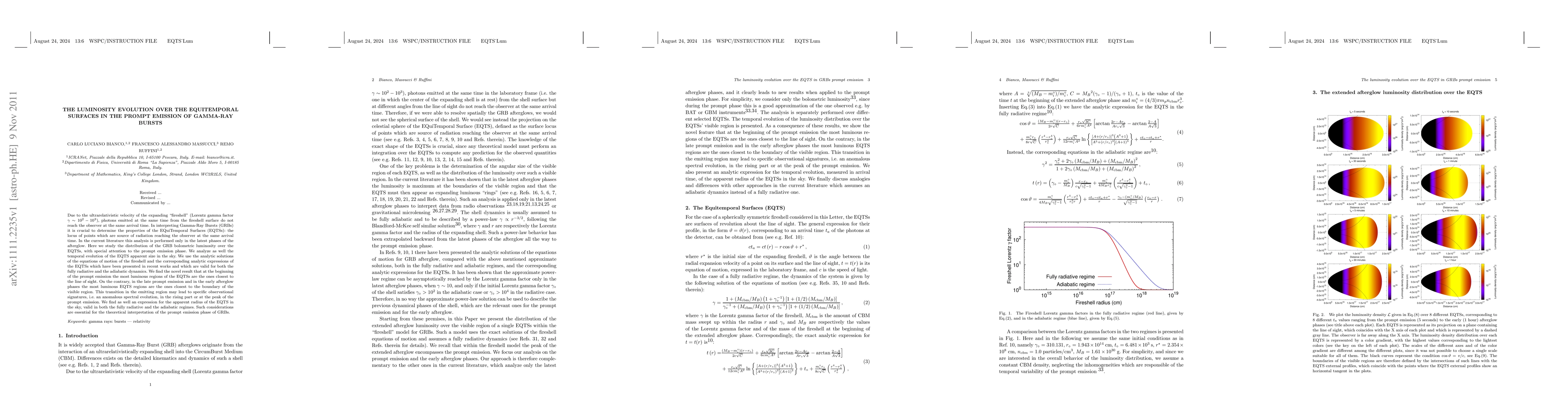 Due to the ultrarelativistic velocity of the expanding "fireshell" (Lorentz gamma factor \gamma \sim 10^2 - 10^3), photons emitted at the same time from the fireshell surface do not reach the observer at the same arrival time. In interpreting Gamma-Ray Bursts (GRBs) it is crucial to determine the properties of the EQuiTemporal Surfaces (EQTSs): the locus of points which are source of radiation reaching the observer at the same arrival time. In the current literature this analysis is performed only in the latest phases of the afterglow. Here we study the distribution of the GRB bolometric luminosity over the EQTSs, with special attention to the prompt emission phase. We analyze as well the temporal evolution of the EQTS apparent size in the sky. We use the analytic solutions of the equations of motion of the fireshell and the corresponding analytic expressions of the EQTSs which have been presented in recent works and which are valid for both the fully radiative and the adiabatic dynamics. We find the novel result that at the beginning of the prompt emission the most luminous regions of the EQTSs are the ones closest to the line of sight. On the contrary, in the late prompt emission and in the early afterglow phases the most luminous EQTS regions are the ones closest to the boundary of the visible region. This transition in the emitting region may lead to specific observational signatures, i.e. an anomalous spectral evolution, in the rising part or at the peak of the prompt emission. We find as well an expression for the apparent radius of the EQTS in the sky, valid in both the fully radiative and the adiabatic regimes. Such considerations are essential for the theoretical interpretation of the prompt emission phase of GRBs.