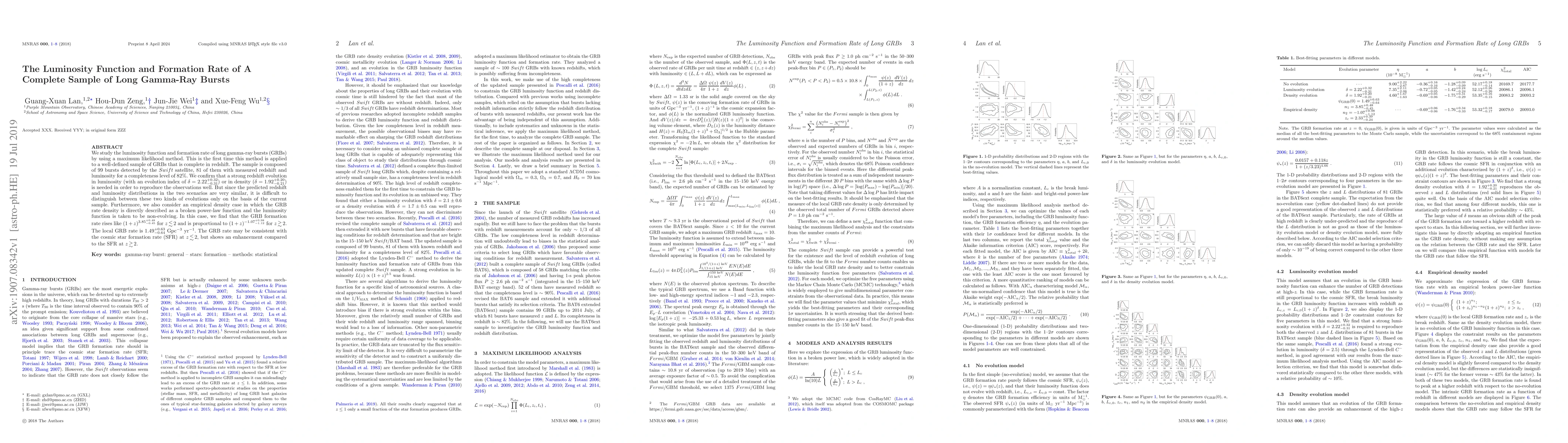 This study employs a maximum likelihood method to analyze the luminosity function and formation rate of a complete redshift sample of 99 long gamma-ray bursts (GRBs) detected by the Swift satellite. The research finds strong evidence for redshift evolution in luminosity or density, but distinguishing between these evolutions remains challenging.