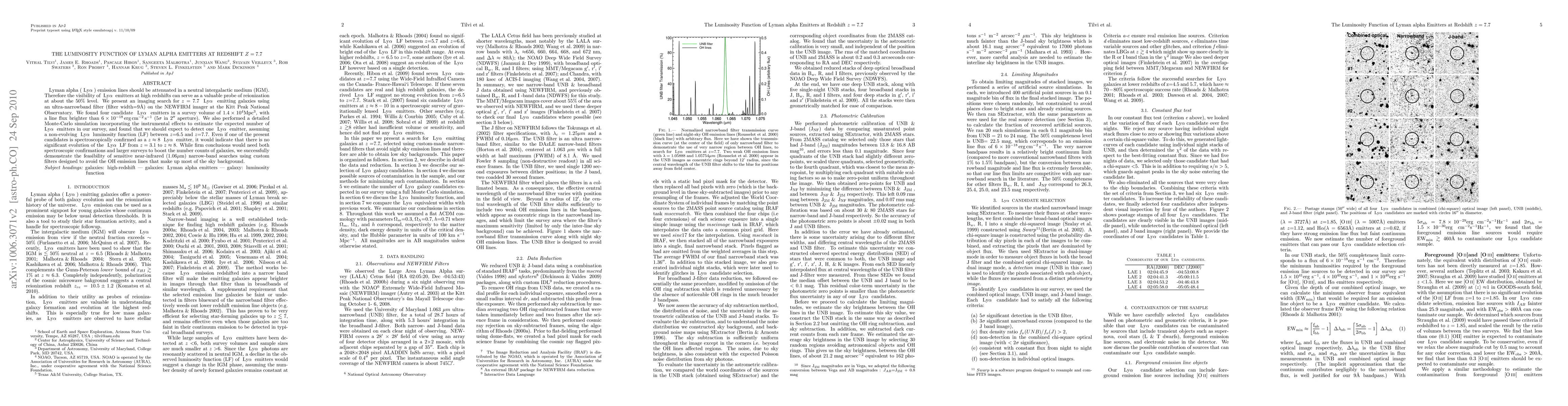 The research utilized an ultra-narrowband filter (9A width, central wavelength 1.063 µm) on the NEWFIRM imager at Kitt Peak National Observatory to search for Lyman alpha emitters at redshift z=7.7. A detailed Monte-Carlo simulation was performed to estimate the expected number of Lyman alpha emitters in the survey.