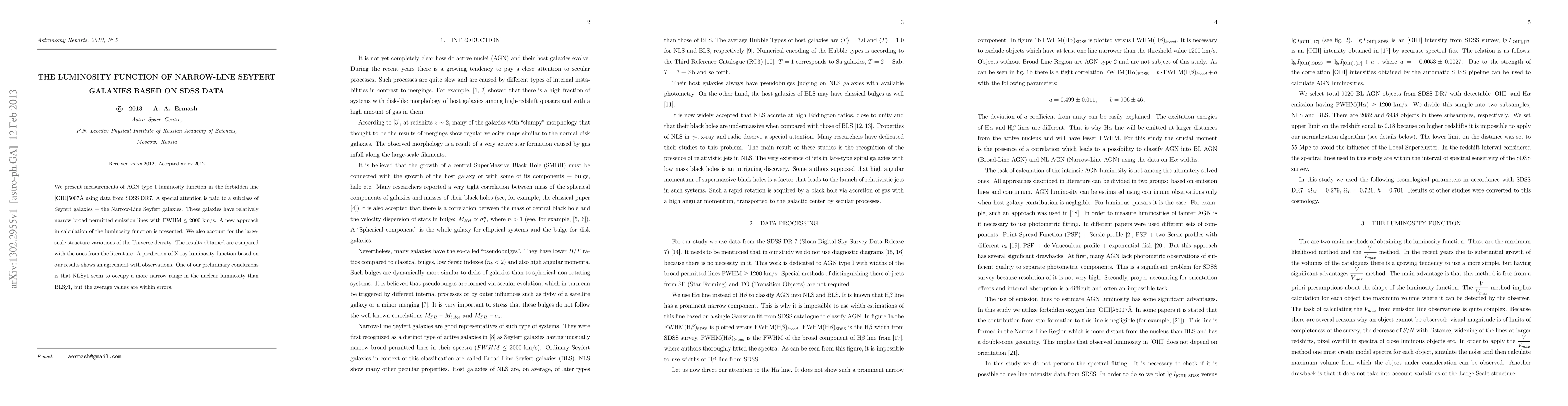 We present measurements of AGN type 1 luminosity function in the forbidden line [OIII]5007\AA using data from SDSS DR7. A special attention is paid to a subclass of Seyfert galaxies - the Narrow-Line Seyfert galaxies. These galaxies have relatively narrow broad permitted emission lines with FWHM $\leq 2000$ km/s. A new approach in calculation of the luminosity function is presented. We also account for the large-scale structure variations of the Universe density. The results obtained are compared with the ones from the literature. A prediction of x-ray luminosity function based on our results shows an agreement with observations. One of our preliminary conclusions is that NLSy1 seem to occupy a more narrow range in the nuclear luminosity than BLSy1, but the average values are within errors.