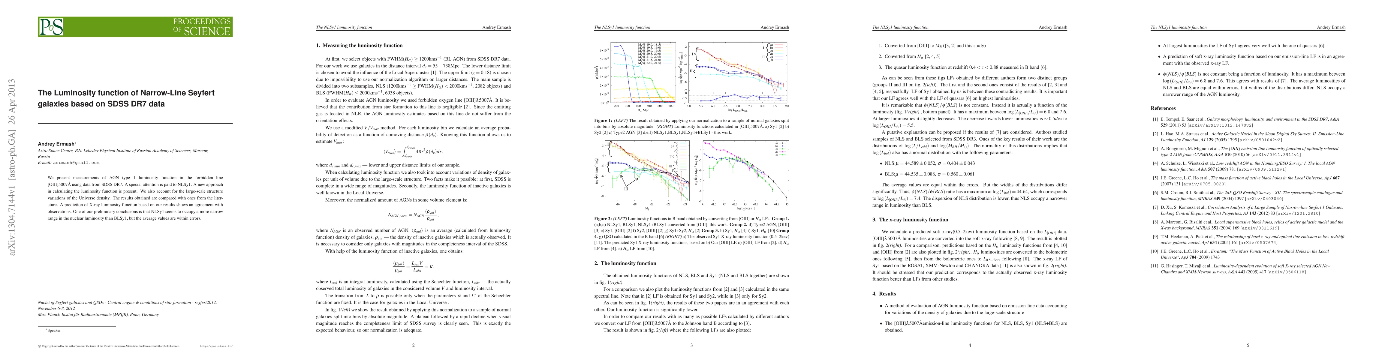 We present measurements of AGN type 1 luminosity function in the forbidden line [OIII]5007\AA using data from SDSS DR7. A special attention is paid to NLSy1. A new approach in calculating the luminosity function is present. We also account for the large-scale structure variations of the Universe density. The results obtained are compared with ones from the literature. A prediction of X-ray luminosity function based on our results shows an agreement with observations. One of our preliminary conclusions is that NLSy1 seems to occupy a more narrow range in the nuclear luminosity than BLSy1, but the average values are within errors.