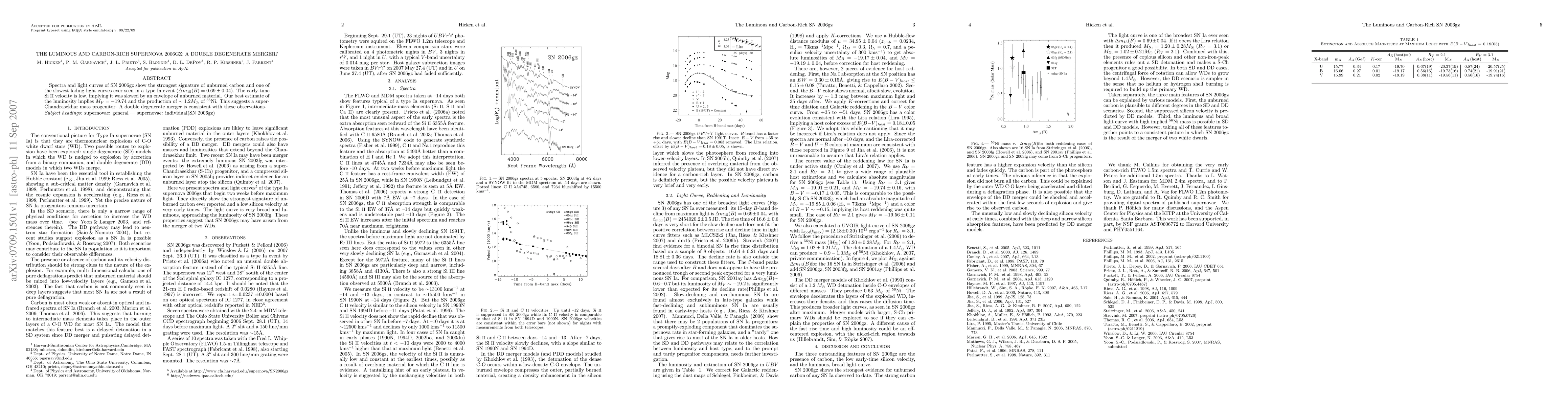 Spectra and light curves of SN 2006gz show the strongest signature of unburned carbon and one of the slowest fading light curves ever seen in a type Ia event (Delta m_15 = 0.69 +/- 0.04). The early-time Si II velocity is low, implying it was slowed by an envelope of unburned material. Our best estimate of the luminosity implies M_V = -19.74 and the production of ~ 1.2 M_sun of 56Ni. This suggests a super-Chandrasekhar mass progenitor. A double degenerate merger is consistent with these observations.