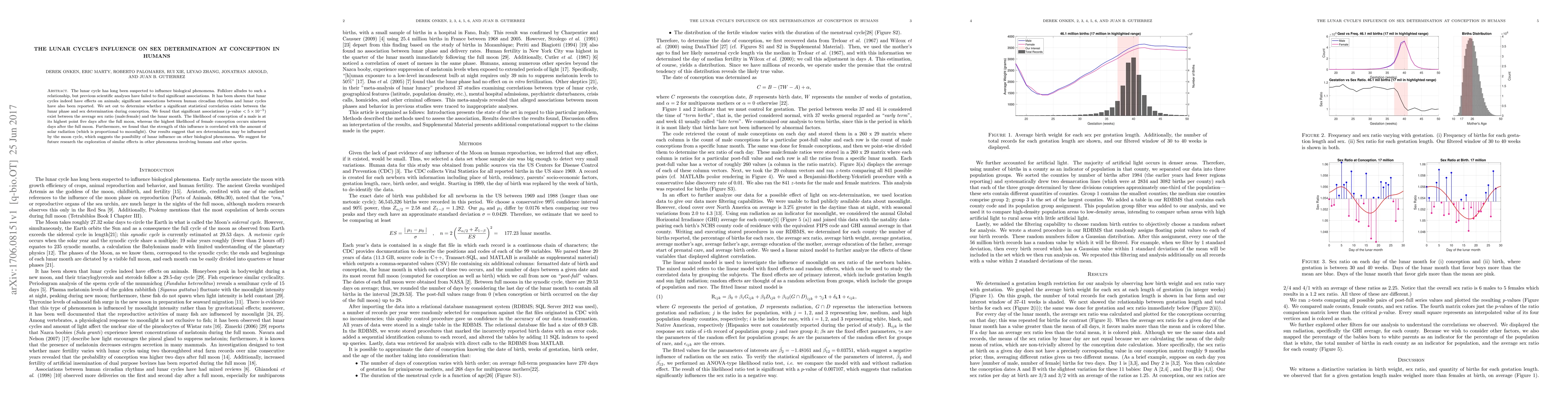 This study finds significant statistical correlations (\textit{p}-value $< 5 \times 10^{-5}$) between the lunar phase and sex ratio at conception, indicating that male conceptions peak five days post full moon, while female conceptions peak nineteen days post full moon. The influence is further linked to solar radiation levels.