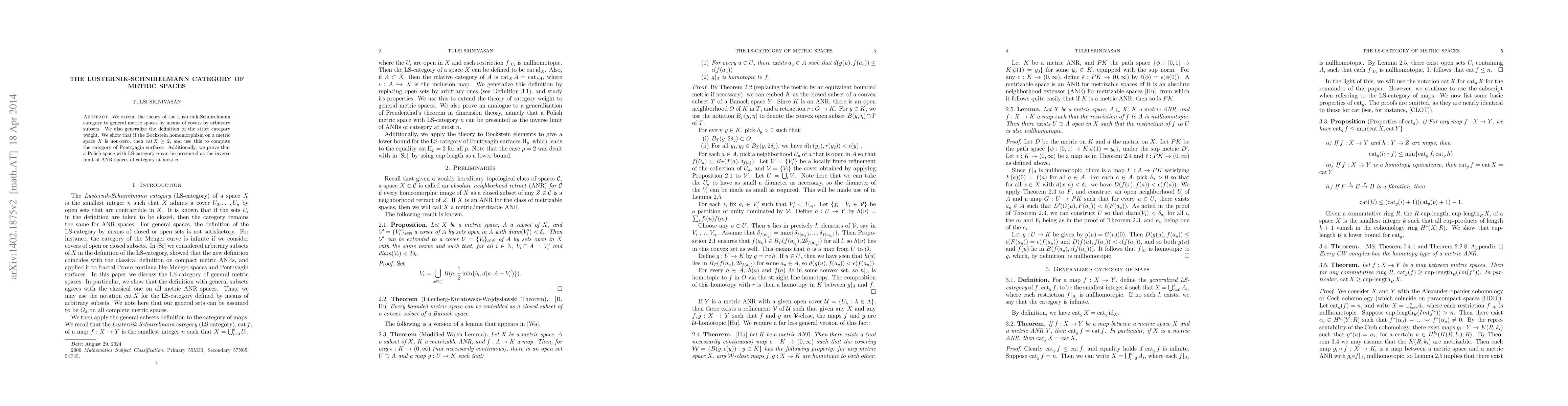 This paper extends the Lusternik-Schnirelmann category theory to general metric spaces, generalizing the strict category weight. It demonstrates that a non-zero Bockstein homomorphism implies a category of at least two and uses this to determine the category of Pontryagin surfaces. The paper also proves that a Polish space with LS-category $n$ can be represented as the inverse limit of ANR spaces of category at most $n$.
