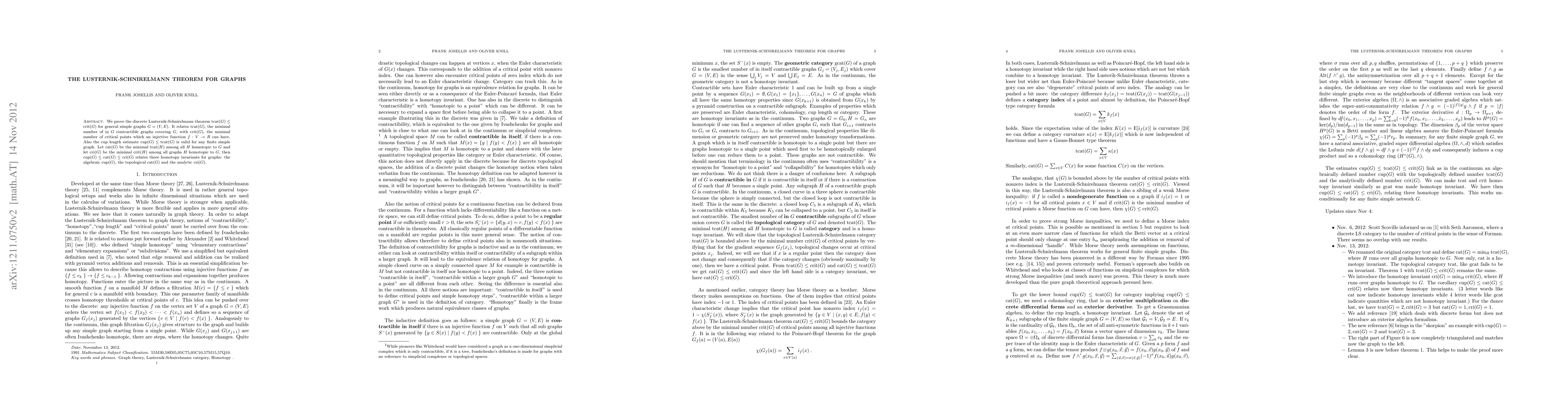 This research establishes a discrete version of the Lusternik-Schnirelmann theorem for graphs, showing that the minimal covering of contractible subgraphs (tcat) is less than or equal to the minimal number of critical points (crit) an injective function can have on the vertex set. It also proves that the cup length (cup) is less than or equal to tcat, applicable to any finite simple graph. The paper further connects three homotopy invariants: the algebraic cup length, the topological category (cat), and the analytic criticality (cri).