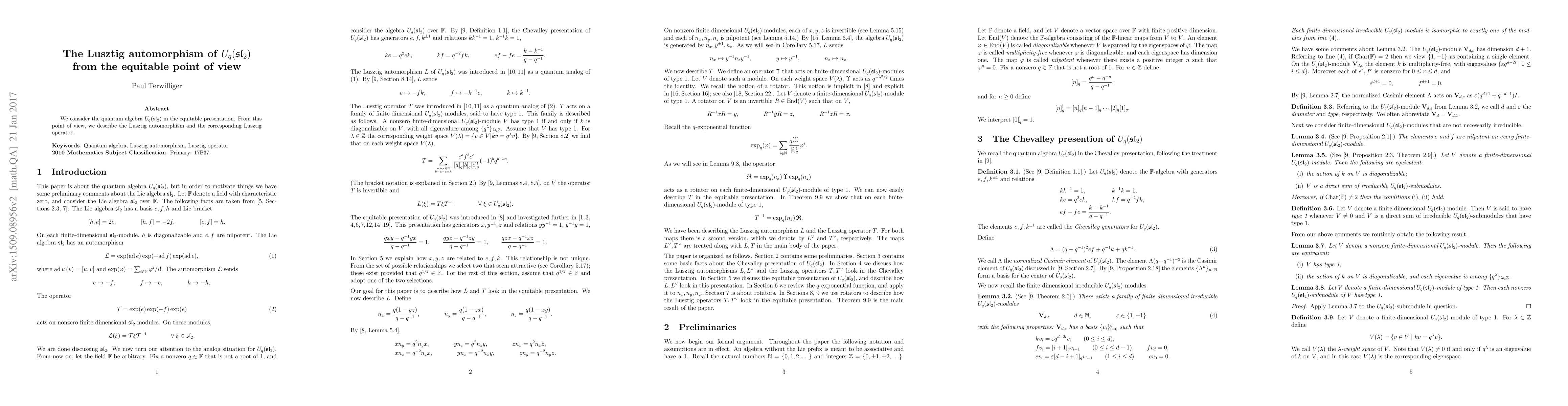 Summary: This paper explores the quantum algebra $U_q(\mathfrak{sl}_2)$ through an equitable presentation, detailing the Lusztig automorphism and the associated Lusztig operator.