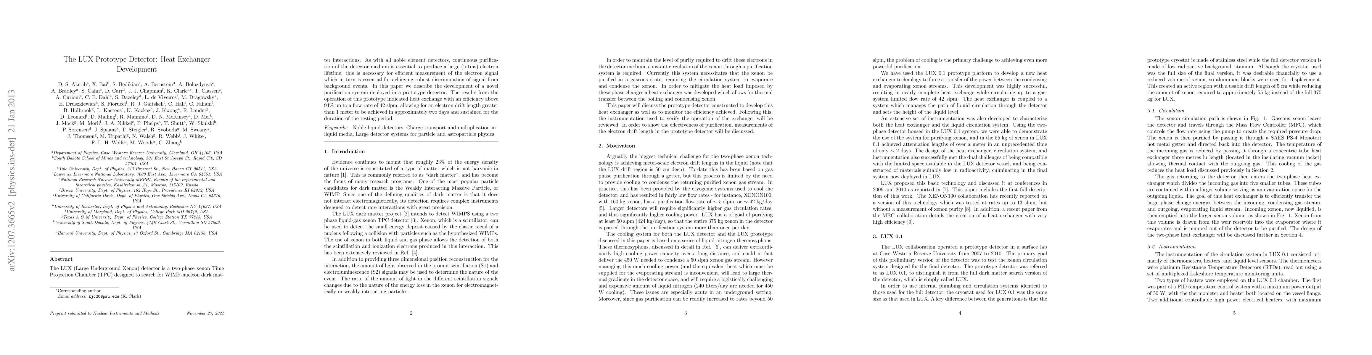 The LUX Prototype Detector paper details the development of a novel purification system for a two-phase xenon TPC, achieving over 94% heat exchange efficiency at 42 slpm flow rates, enabling a large electron lifetime and effective discrimination of dark matter signals.