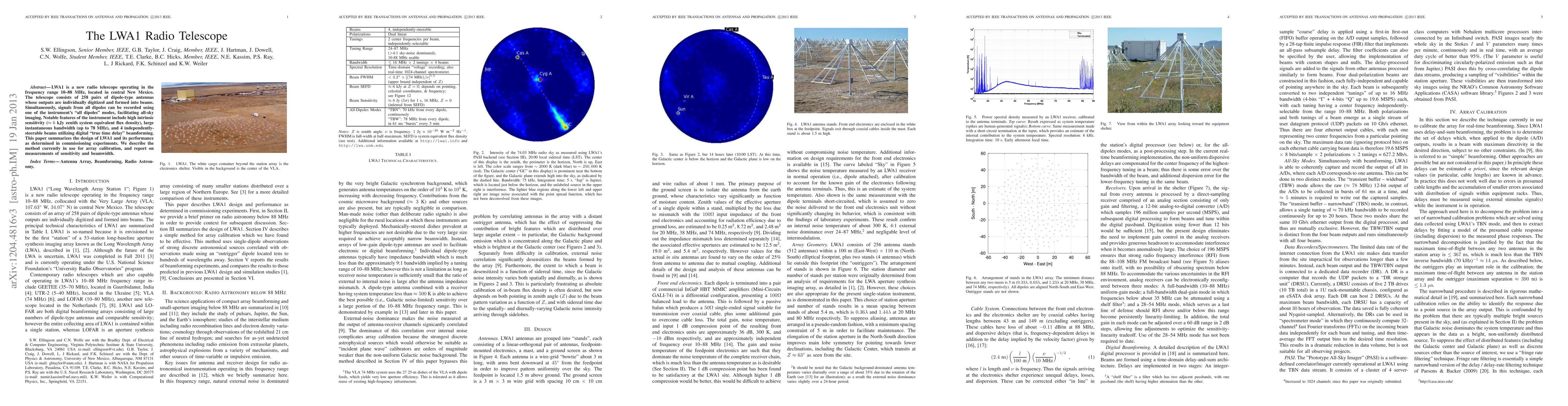 The LWA1 radio telescope in New Mexico features 258 dipole antennas, high sensitivity, and digital beamforming for 4 steerable beams. Commissioning experiments reveal its large instantaneous bandwidth and effective all-sky imaging capabilities.