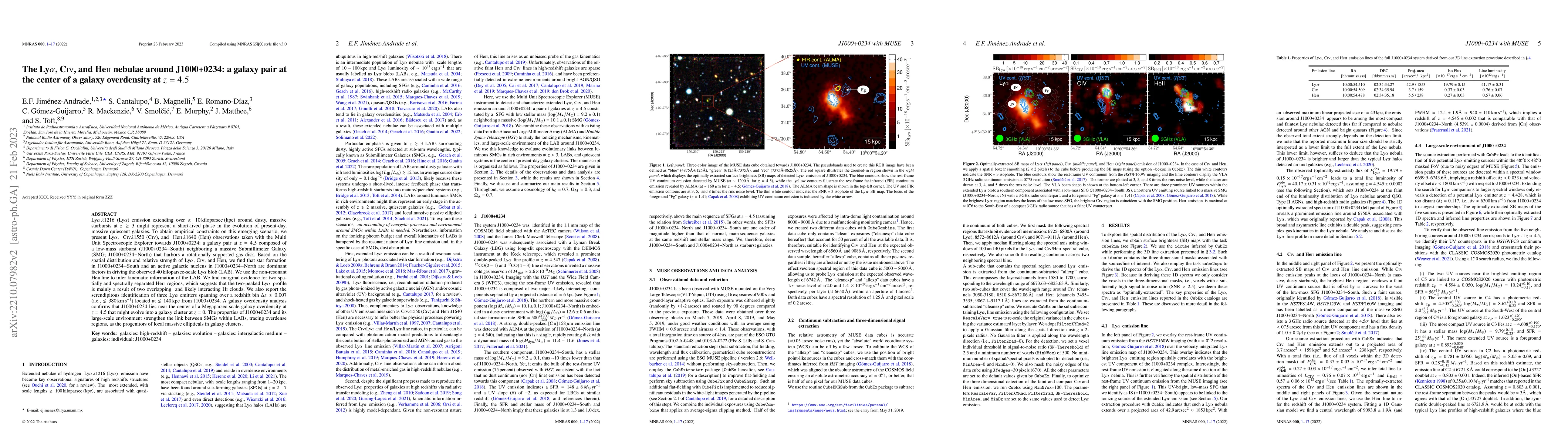 This paper investigates the Ly$\alpha$, CIV, and HeII nebulae around a galaxy pair at $z=4.5$, revealing that star formation and an active galactic nucleus drive a large Ly$\alpha$ blob. The study suggests the blob's two-peaked profile is due to overlapping HI clouds, and identifies a galaxy overdensity indicating potential future cluster formation.