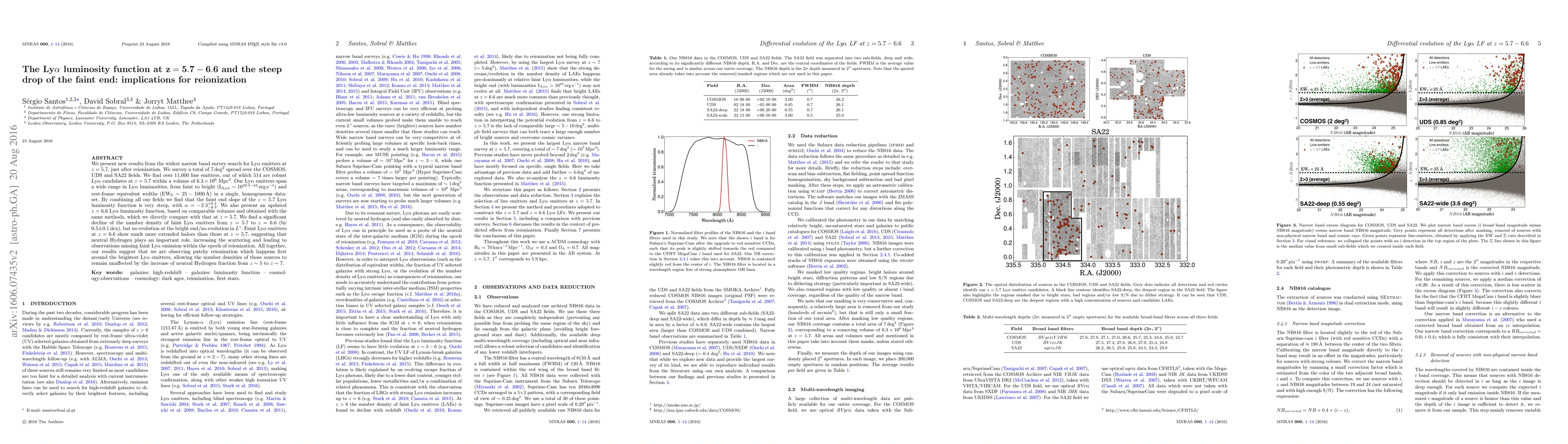 We present new results from the widest narrow band survey search for Lyman-alpha (Lya) emitters at z=5.7, just after reionization. We survey a total of 7 deg$^2$ spread over the COSMOS, UDS and SA22 fields. We find over 11,000 line emitters, out of which 514 are robust Lya candidates at z=5.7 within a volume of 6.3x10$^6$ Mpc$^3$. Our Lya emitters span a wide range in Lya luminosities, from faint to bright (L$_{\rm Ly\alpha}\sim10^{42.5-44}$ erg s$^{-1}$) and rest-frame equivalent widths (EW$_0$~25-1000 \AA) in a single, homogeneous data-set. By combining all our fields we find that the faint end slope of the z=5.7 Lya luminosity function is very steep, with $\alpha=-2.3^{+0.4}_{-0.3}$. We also present an updated z=6.6 Lya luminosity function, based on comparable volumes and obtained with the same methods, which we directly compare with that at z=5.7. We find a significant decline of the number density of faint Lya emitters from z=5.7 to z=6.6 (by $0.5\pm0.1$ dex), but no evolution at the bright end/no evolution in L*. Faint Lya emitters at z=6.6 show much more extended haloes than those at z=5.7, suggesting that neutral Hydrogen plays an important role, increasing the scattering and leading to observations missing faint Lya emission within the epoch of reionization. All together, our results suggest that we are observing patchy reionization which happens first around the brightest Lya emitters, allowing the number densities of those sources to remain unaffected by the increase of neutral Hydrogen fraction from z~5 to z~7.