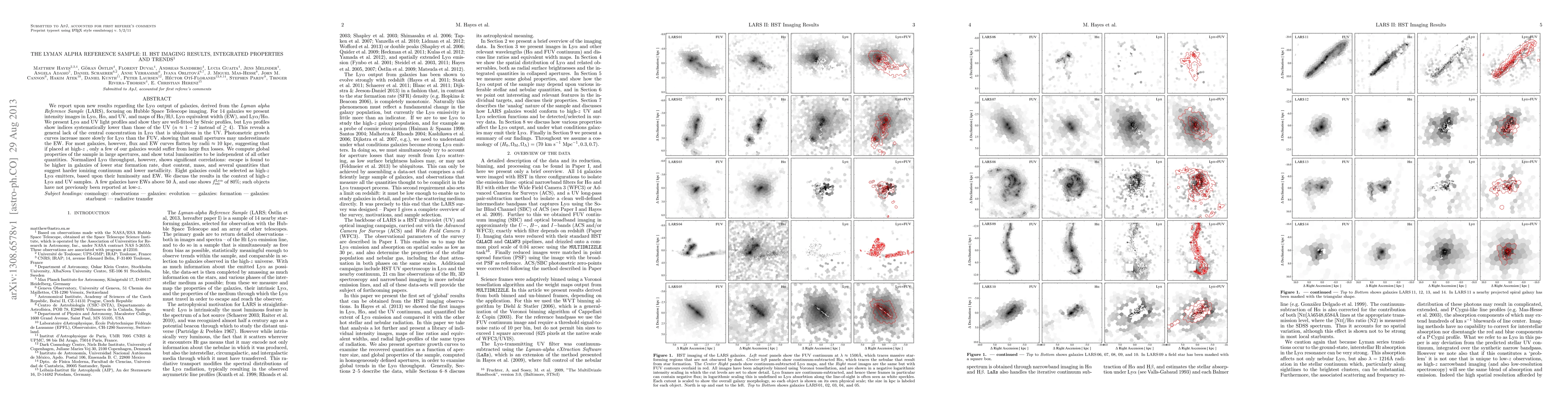 We report upon new results regarding the Lya output of galaxies, derived from the Lyman alpha Reference Sample (LARS), focusing on Hubble Space Telescope imaging. For 14 galaxies we present intensity images in Lya, Halpha, and UV, and maps of Halpha/Hbeta, Lya equivalent width (EW), and Lya/Halpha. We present Lya and UV light profiles and show they are well-fitted by S\'ersic profiles, but Lya profiles show indices systematically lower than those of the UV (n approx 1-2 instead of >~4). This reveals a general lack of the central concentration in Lya that is ubiquitous in the UV. Photometric growth curves increase more slowly for Lya than the FUV, showing that small apertures may underestimate the EW. For most galaxies, however, flux and EW curves flatten by radii ~10 kpc, suggesting that if placed at high-z, only a few of our galaxies would suffer from large flux losses. We compute global properties of the sample in large apertures, and show total luminosities to be independent of all other quantities. Normalized Lya throughput, however, shows significant correlations: escape is found to be higher in galaxies of lower star formation rate, dust content, mass, and several quantities that suggest harder ionizing continuum and lower metallicity. Eight galaxies could be selected as high-z Lya emitters, based upon their luminosity and EW. We discuss the results in the context of high-z Lya and UV samples. A few galaxies have EWs above 50 AA, and one shows f_escLya of 80%; such objects have not previously been reported at low-z.