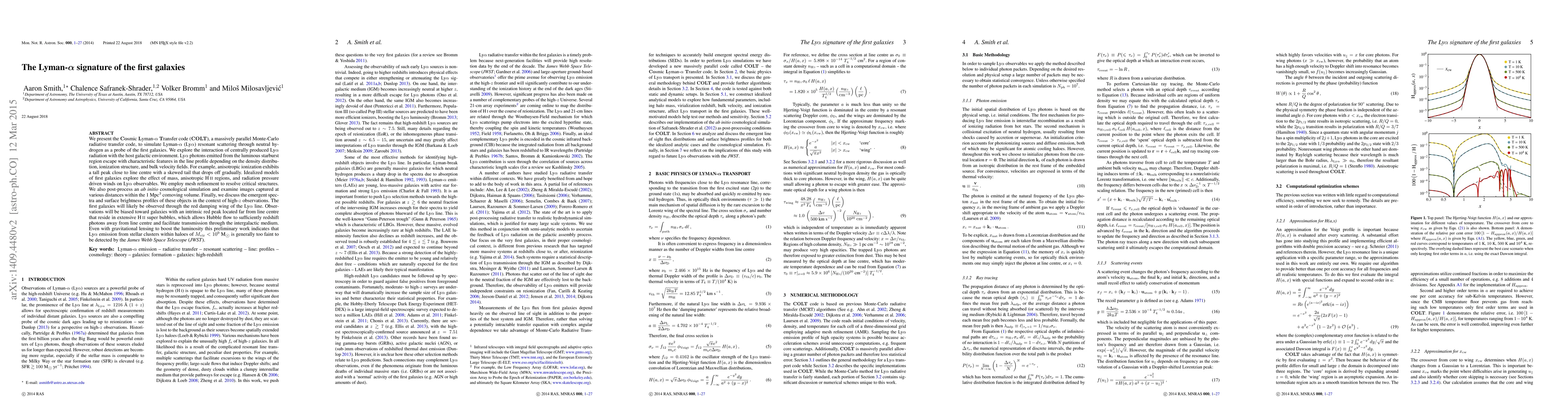 We present the Cosmic Lyman-$\alpha$ Transfer code (COLT), a massively parallel Monte-Carlo radiative transfer code, to simulate Lyman-$\alpha$ (Ly$\alpha$) resonant scattering through neutral hydrogen as a probe of the first galaxies. We explore the interaction of centrally produced Ly$\alpha$ radiation with the host galactic environment. Ly$\alpha$ photons emitted from the luminous starburst region escape with characteristic features in the line profile depending on the density distribution, ionization structure, and bulk velocity fields. For example, anisotropic ionization exhibits a tall peak close to line centre with a skewed tail that drops off gradually. Idealized models of first galaxies explore the effect of mass, anisotropic H II regions, and radiation pressure driven winds on Ly$\alpha$ observables. We employ mesh refinement to resolve critical structures. We also post-process an ab initio cosmological simulation and examine images captured at various escape distances within the 1 Mpc$^3$ comoving volume. Finally, we discuss the emergent spectra and surface brightness profiles of these objects in the context of high-$z$ observations. The first galaxies will likely be observed through the red damping wing of the Ly$\alpha$ line. Observations will be biased toward galaxies with an intrinsic red peak located far from line centre that reside in extensive H II super bubbles, which allows Hubble flow to sufficiently redshift photons away from line centre and facilitate transmission through the intergalactic medium (IGM). Even with gravitational lensing to boost the luminosity this preliminary work indicates that Ly$\alpha$ emission from stellar clusters within haloes of $M_{\rm vir}<10^9~{\rm M}_\odot$ is generally too faint to be detected by the James Webb Space Telescope (JWST).