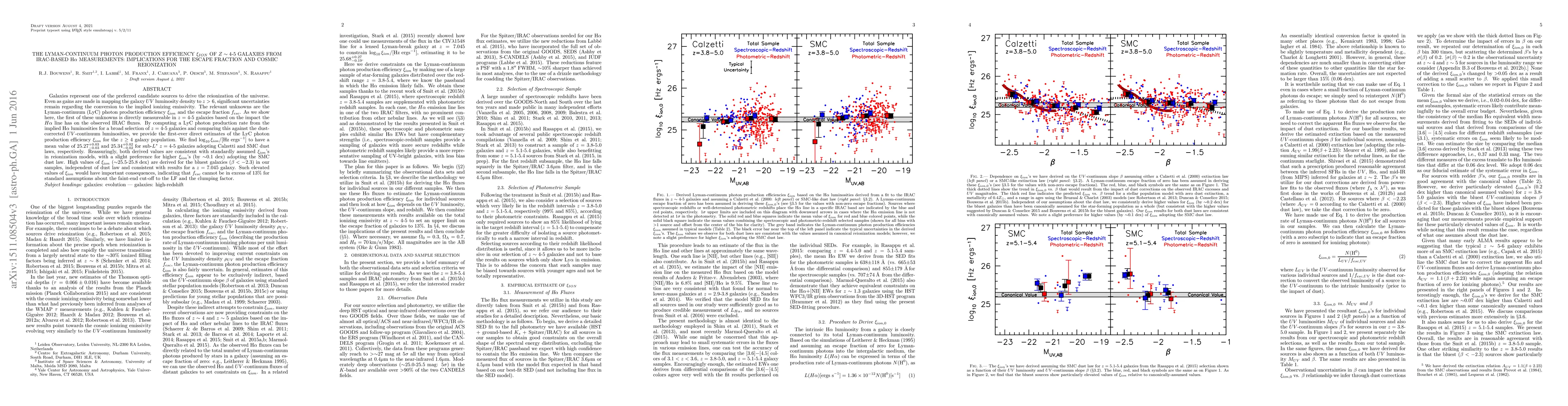 This paper provides direct estimates of the Lyman-continuum photon production efficiency (xi_{ion}) in z=4-5 galaxies using Halpha line measurements, finding a mean value of log_{10} xi_{ion}/[Hz/ergs] around 25.27-25.34, consistent with reionization models. Elevated values suggest a low escape fraction for ionizing photons, supporting low observed LyC leakage rates.