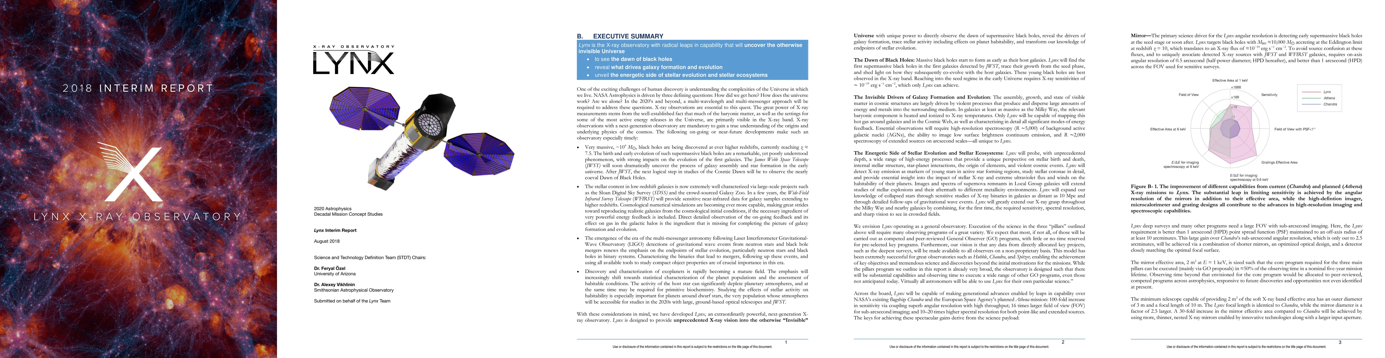 The Lynx Mission Concept Study Interim Report outlines a next-generation X-ray observatory promising significant advancements over current missions, including a 100-fold increase in sensitivity and a 16 times larger field of view, designed to explore black holes, galaxy formation, and stellar evolution. The mission aims to provide unprecedented capabilities for a broad range of astronomical research.