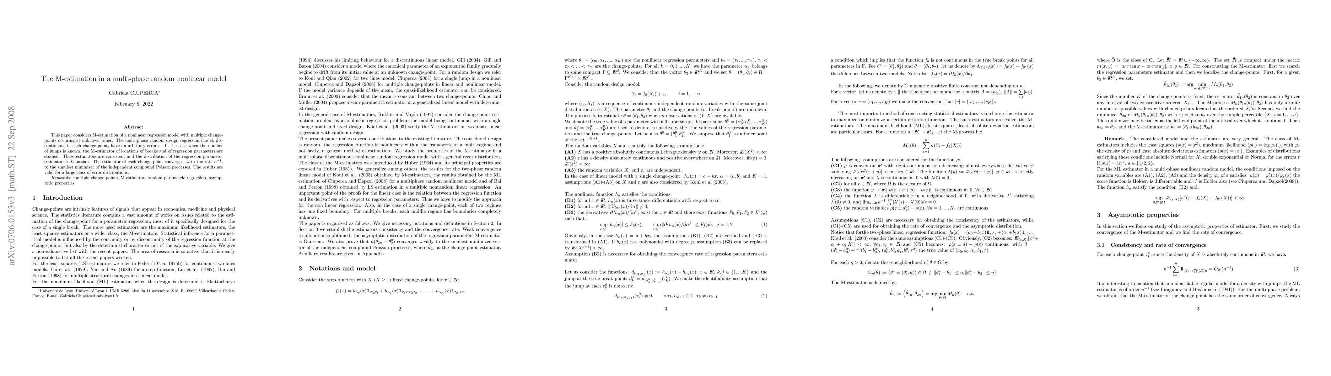 This paper considers M-estimation of a nonlinear regression model with multiple change-points occuring at unknown times. The multi-phase random design regression model, discontinuous in each change-point, have an arbitrary error $\epsilon$. In the case when the number of jumps is known, the M-estimator of locations of breaks and of regression parameters are studied. These estimators are consistent and the distribution of the regression parameter estimators is Gaussian. The estimator of each change-point converges, with the rate $n^{-1}$, to the smallest minimizer of the independent compound Poisson processes. The results are valid for a large class of error distributions.