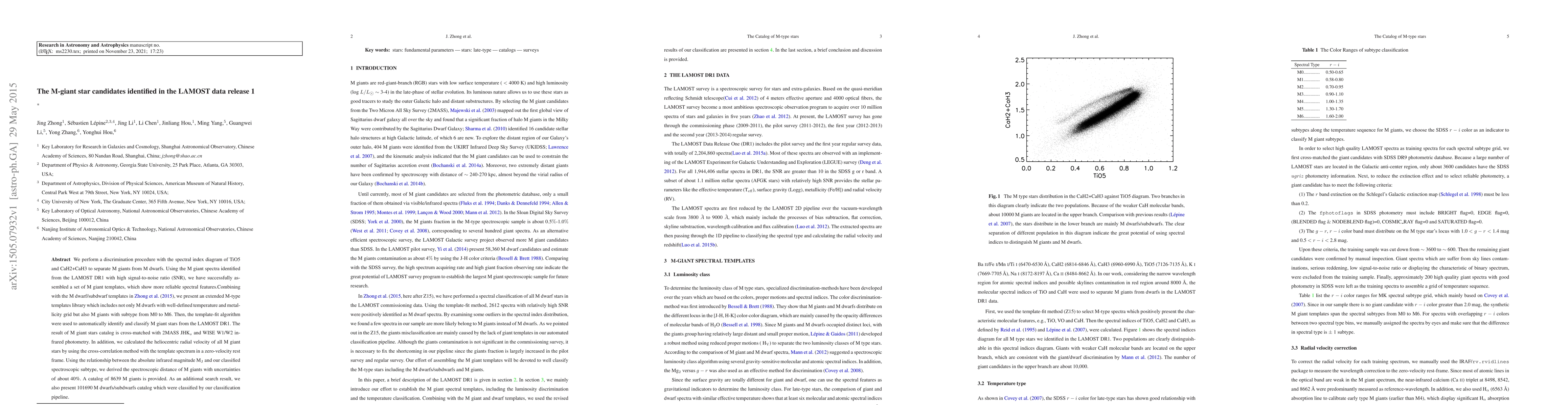 We perform a discrimination procedure with the spectral index diagram of TiO5 and CaH2+CaH3 to separate M giants from M dwarfs. Using the M giant spectra identified from the LAMOST DR1 with high signal-to-noise ratio (SNR), we have successfully assembled a set of M giant templates, which show more reliable spectral features. Combining with the M dwarf/subdwarf templates in Zhong et al. (2015), we present an extended M-type templates library which includes not only M dwarfs with well-defined temperature and metallicity grid but also M giants with subtype from M0 to M6. Then, the template-fit algorithm were used to automatically identify and classify M giant stars from the LAMOST DR1. The result of M giant stars catalog is cross-matched with 2MASS JHKs and WISE W1/W2 infrared photometry. In addition, we calculated the heliocentric radial velocity of all M giant stars by using the cross-correlation method with the template spectrum in a zero-velocity restframe. Using the relationship between the absolute infrared magnitude MJ and our classified spectroscopic subtype, we derived the spectroscopic distance of M giants with uncertainties of about 40%. A catalog of 8639 M giants is provided. As an additional search result, we also present 101690 M dwarfs/subdwarfs catalog which were classified by our classification pipeline.