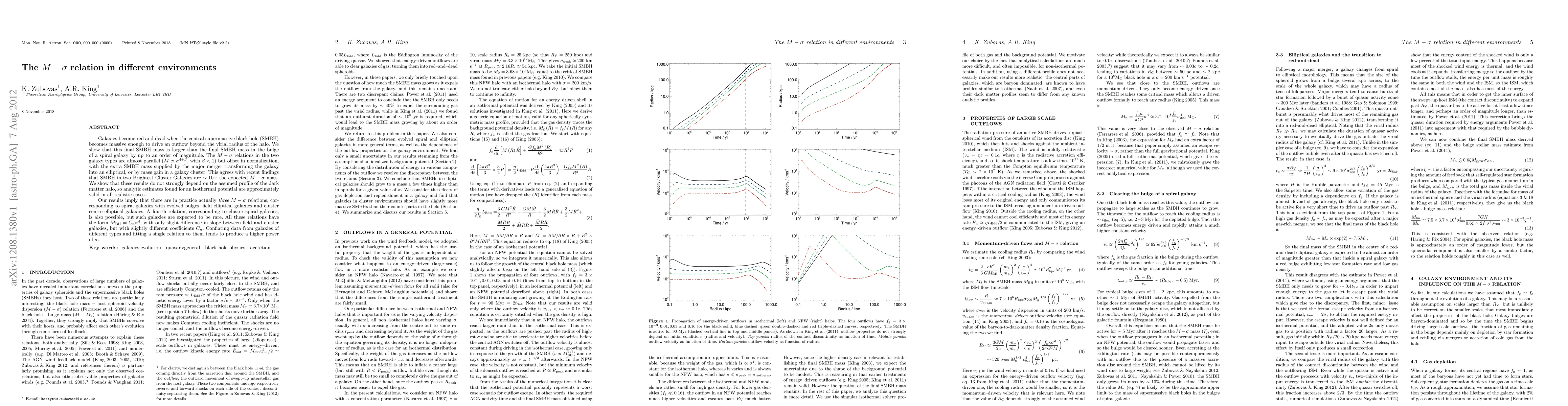 Galaxies become red and dead when the central supermassive black hole (SMBH) becomes massive enough to drive an outflow beyond the virial radius of the halo. We show that this final SMBH mass is larger than the final SMBH mass in the bulge of a spiral galaxy by up to an order of magnitude. The M - \sigma relations in the two galaxy types are almost parallel (M \propto \sigma^{4+\beta}, with \beta < 1) but offset in normalization, with the extra SMBH mass supplied by the major merger transforming the galaxy into an elliptical, or by mass gain in a galaxy cluster. This agrees with recent findings that SMBH in two Brightest Cluster Galaxies are \sim 10\times the expected M-\sigma mass. We show that these results do not strongly depend on the assumed profile of the dark matter halo, so analytic estimates found for an isothermal potential are approximately valid in all realistic cases. Our results imply that there are in practice actually {\it three} M - \sigma relations, corresponding to spiral galaxies with evolved bulges, field elliptical galaxies and cluster centre elliptical galaxies. A fourth relation, corresponding to cluster spiral galaxies, is also possible, but such galaxies are expected to be rare. All these relations have the form M_{\rm BH} = C_n\sigma^4, with only slight difference in slope between field and cluster galaxies, but with slightly different coefficients C_n. Conflating data from galaxies of different types and fitting a single relation to them tends to produce a higher power of \sigma.
