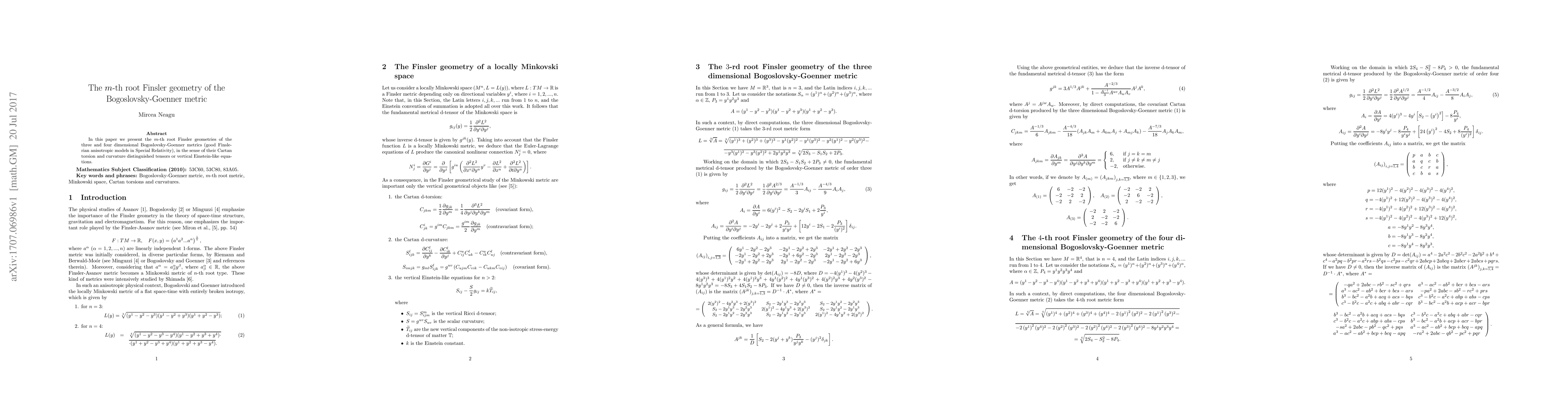 This paper explores the m-th root Finsler geometries of the Bogoslovsky-Goenner metrics in three and four dimensions, focusing on their Cartan torsion and curvature tensors, and their implications for vertical Einstein-like equations in Special Relativity.