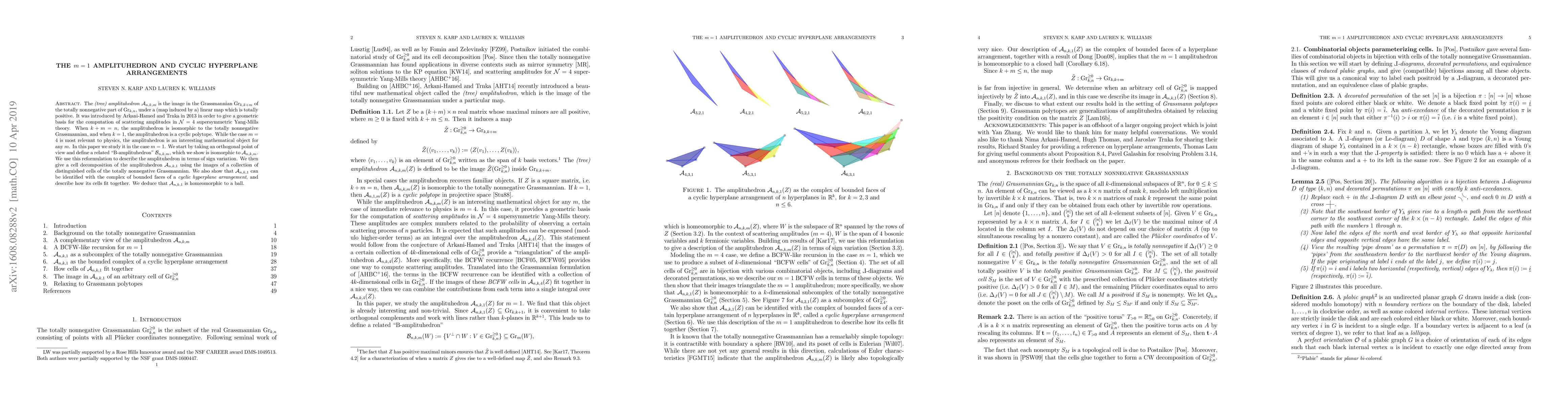 This paper explores the m=1 amplituhedron, introducing a related "B-amplituhedron" that is isomorphic to the original. It provides a cell decomposition of A(n,k,1) and identifies it with the complex of bounded faces of a cyclic hyperplane arrangement, concluding that it is homeomorphic to a ball.