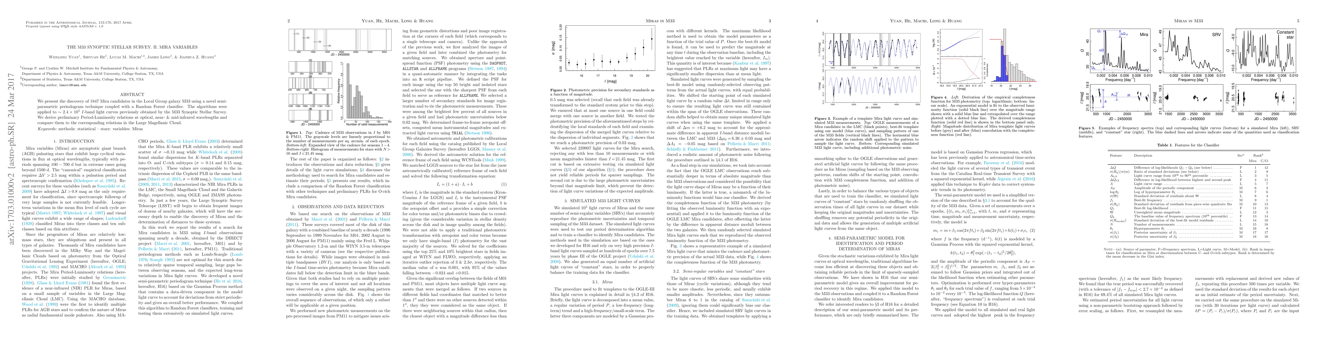 The study identifies 1847 Mira variable candidates in the galaxy M33 using a combination of a semi-parametric periodogram and a Random Forest classifier. Preliminary Period-Luminosity relations are derived and compared to those in the Large Magellanic Cloud.
