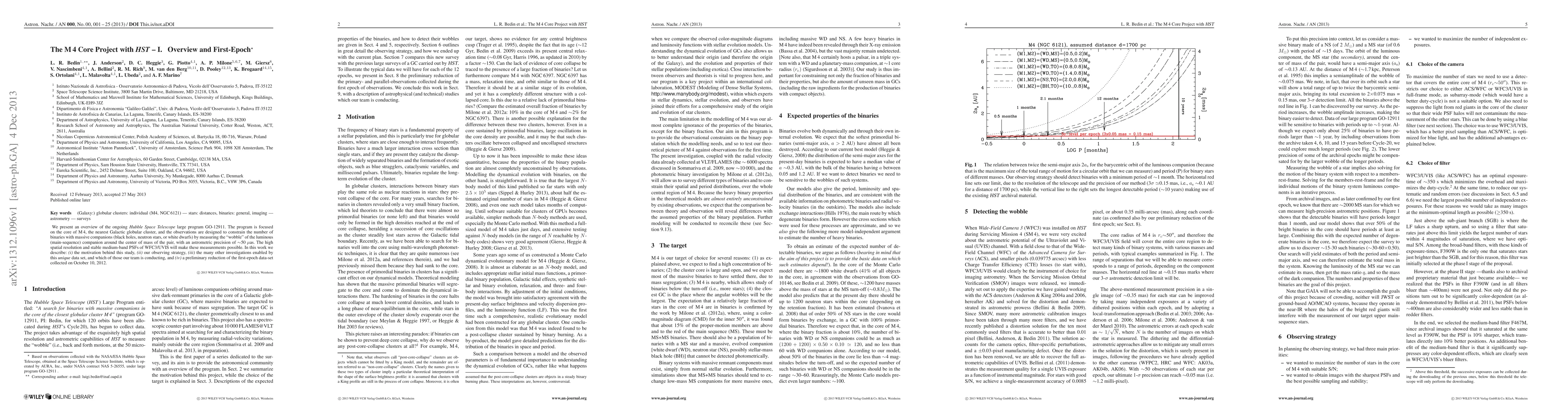 We present an overview of the ongoing Hubble Space Telescope large program GO-12911. The program is focused on the core of M4, the nearest Galactic globular cluster, and the observations are designed to constrain the number of binaries with massive companions (black holes, neutron stars, or white dwarfs) by measuring the ``wobble'' of the luminous (main-sequence) companion around the center of mass of the pair, with an astrometric precision of ~50 micro-arcseconds. The high spatial resolution and stable medium-band PSFs of WFC3/UVIS will make these measurements possible. In this work we describe: (i) the motivation behind this study, (ii) our observing strategy, (iii) the many other investigations enabled by this unique data set, and which of those our team is conducting, and (iv) a preliminary reduction of the first-epoch data-set collected on October 10, 2012.