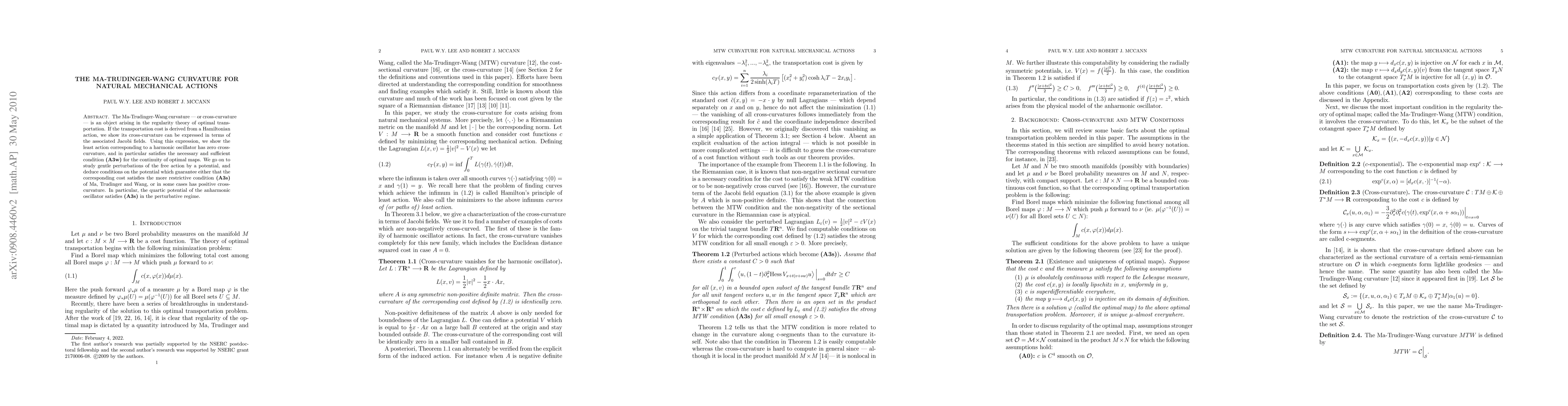 The Ma-Trudinger-Wang curvature --- or cross-curvature --- is an object arising in the regularity theory of optimal transportation. If the transportation cost is derived from a Hamiltonian action, we show its cross-curvature can be expressed in terms of the associated Jacobi fields. Using this expression, we show the least action corresponding to a harmonic oscillator has zero cross-curvature, and in particular satisfies the necessary and sufficient condition \Athreew\ for the continuity of optimal maps. We go on to study gentle perturbations of the free action by a potential, and deduce conditions on the potential which guarantee either that the corresponding cost satisfies the more restrictive condition \Athrees\ of Ma, Trudinger and Wang, or in some cases has positive cross-curvature. In particular, the quartic potential of the anharmonic oscillator satisfies \Athrees\ in the perturbative regime.