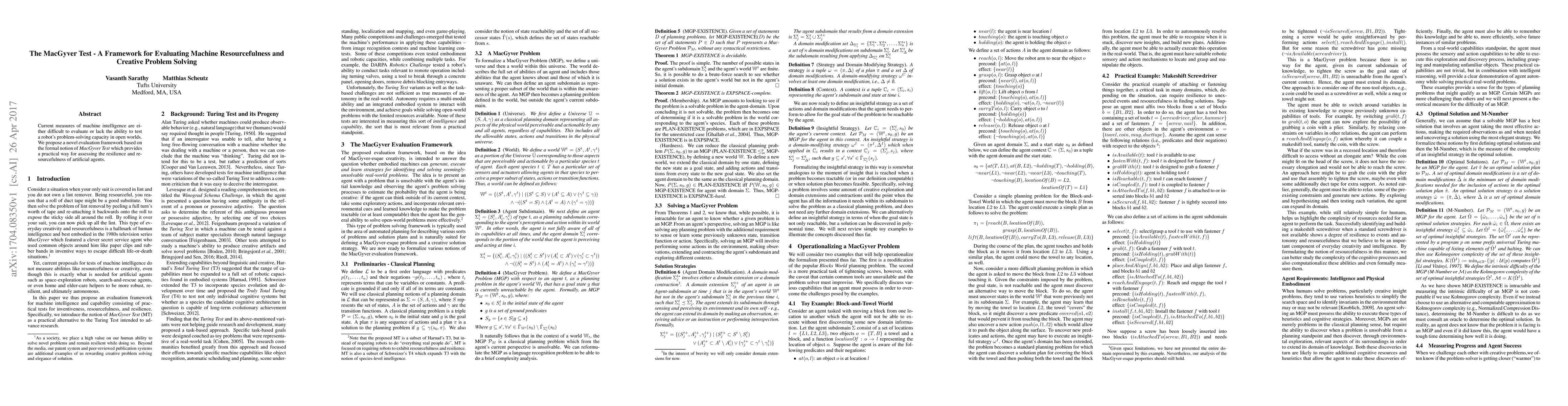 Summary: This paper introduces the MacGyver Test framework to evaluate a robot's problem-solving abilities in open environments, focusing on resilience and resourcefulness, addressing the limitations of current measures of machine intelligence. The framework aims to provide a practical assessment of artificial agents' creative problem-solving skills.