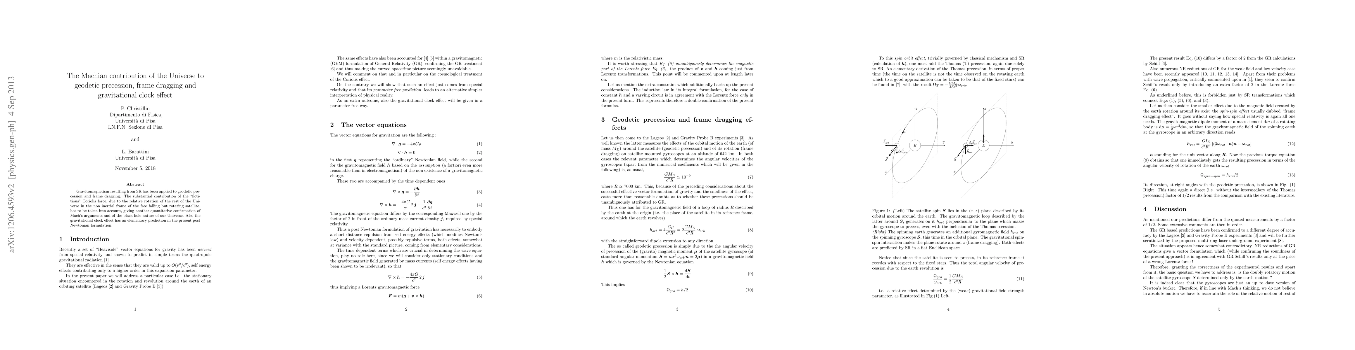 Gravitomagnetism resulting from SR has been applied to geodetic precession and frame dragging. The substantial contribution of the "fictitious" Coriolis force, due to the relative rotation of the rest of the Universe in the non inertial frame of the free falling but rotating satellite, has to be taken into account, giving another quantitative confirmation of Mach's arguments and of the black hole nature of our Universe. Also the gravitational clock effect has an elementary prediction in the present post Newtonian formulation. A derivation of the centrifugal force from an effective vector formulation of gravitation is attempted. The centrifugal force appears to be due to a relativistic effect of the counter-rotating Universe. Gravitomagnetic energy effects, a million times stronger than the self energy effects responsible for curvature in the GR language, would thus produce the centrifugal acceleration. The Machian picture, already successful in the case of the Coriolis force, gets an additional circumstantial support.