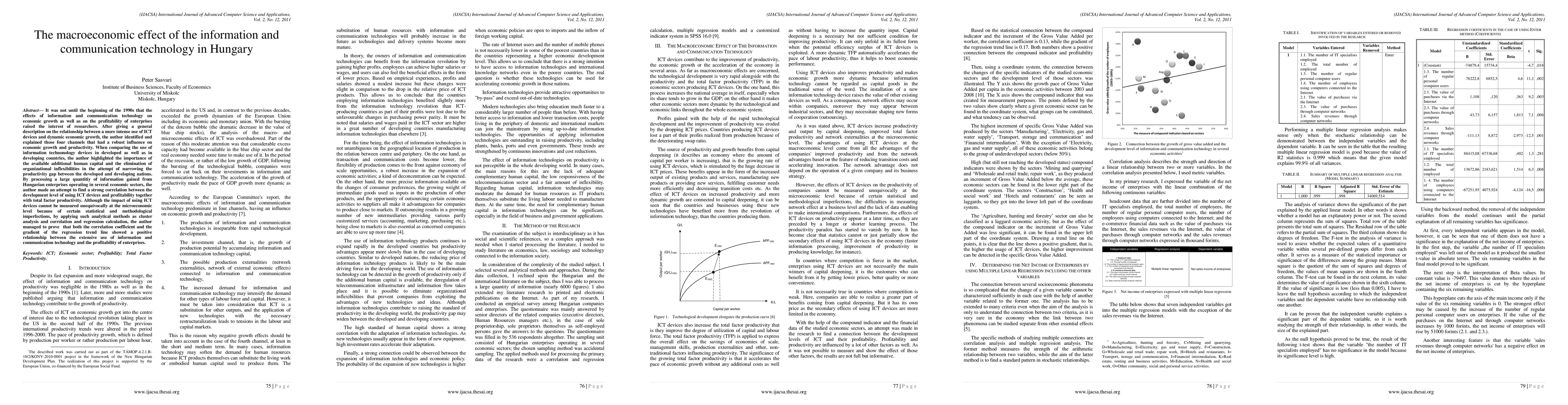 It was not until the beginning of the 1990s that the effects of information and communication technology on economic growth as well as on the profitability of enterprises raised the interest of researchers. After giving a general description on the relationship between a more intense use of ICT devices and dynamic economic growth, the author identified and explained those four channels that had a robust influence on economic growth and productivity. When comparing the use of information technonology devices in developed as well as in developing countries, the author highlighted the importance of the available additional human capital and the elimination of organizational inflexibilities in the attempt of narrowing the productivity gap between the developed and developing nations. By processing a large quantitiy of information gained from Hungarian enterprises operating in several economic sectors, the author made an attempt to find a strong correlation between the development level of using ICT devices and profitability together with total factor productivity. Although the impact of using ICT devices cannot be measured unequivocally at the microeconomic level because of certain statistical and methodological imperfections, by applying such analytical methods as cluster analysis and correlation and regression calculation, the author managed to prove that both the correlation coefficient and the gradient of the regression trend line showed a positive relationship between the extensive use of information and communication technology and the profitability of enterprises.