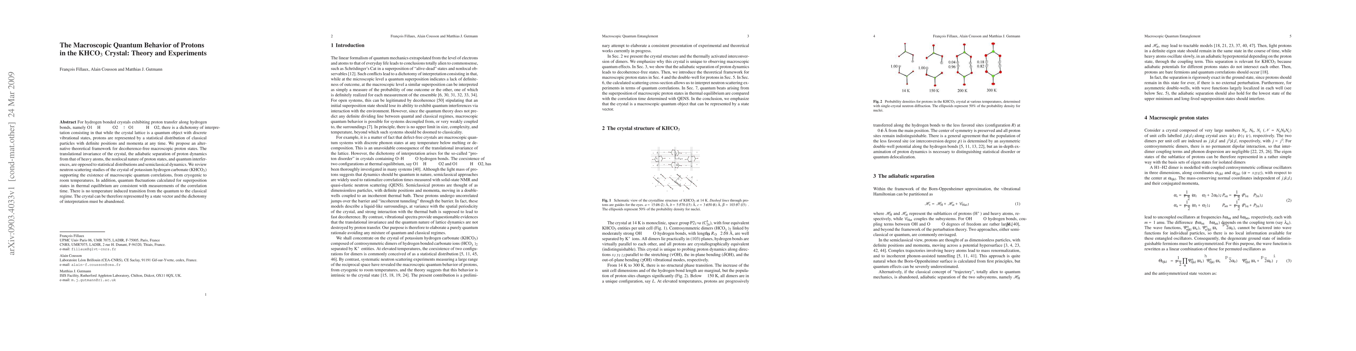 For hydrogen bonded crystals exhibiting proton transfer along hydrogen bonds, namely $\mathrm{O1-H}... \mathrm{O2} \longleftrightarrow \mathrm{O1}... \mathrm{H-O2}$, there is a dichotomy of interpretation consisting in that while the crystal lattice is a quantum object with discrete vibrational states, protons are represented by a statistical distribution of classical particles with definite positions and momenta at any time. We propose an alternative theoretical framework for decoherence-free macroscopic proton states. The translational invariance of the crystal, the adiabatic separation of proton dynamics from that of heavy atoms, the nonlocal nature of proton states, and quantum interferences, are opposed to statistical distributions and semiclassical dynamics. We review neutron scattering studies of the crystal of potassium hydrogen carbonate (KHCO$_3$) supporting the existence of macroscopic quantum correlations, from cryogenic to room temperatures. In addition, quantum fluctuations calculated for superposition states in thermal equilibrium are consistent with measurements of the correlation time. There is no temperature induced transition from the quantum to the classical regime. The crystal can be therefore represented by a state vector and the dichotomy of interpretation must be abandoned.