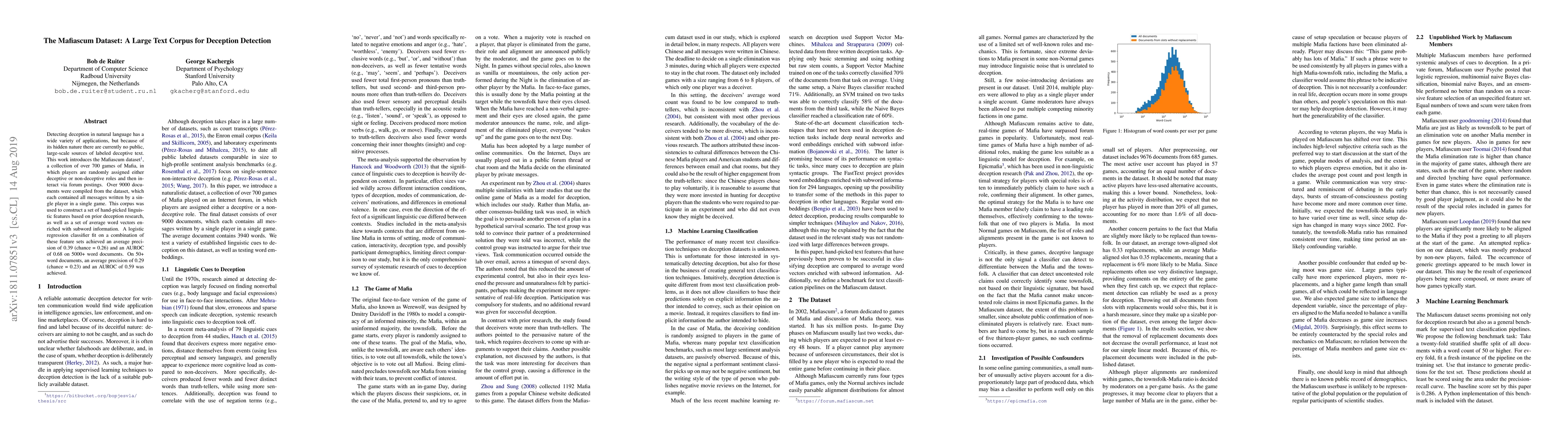 The Mafiascum dataset introduces a large corpus of over 9000 documents from Mafia games to study deception detection in natural language. A logistic regression classifier achieved moderate success, with an average precision of 0.39 and an AUROC of 0.68 on longer documents.