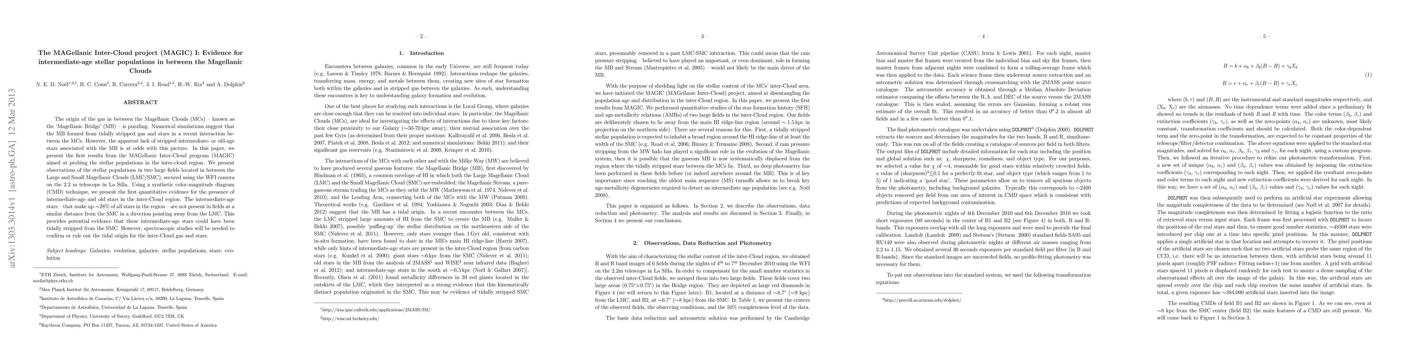 The MAGIC project presents evidence for intermediate-age stellar populations in the Magellanic Bridge, suggesting these stars may have been tidally stripped from the Small Magellanic Cloud (SMC). Further spectroscopic studies are required to confirm the tidal origin of these stars.
