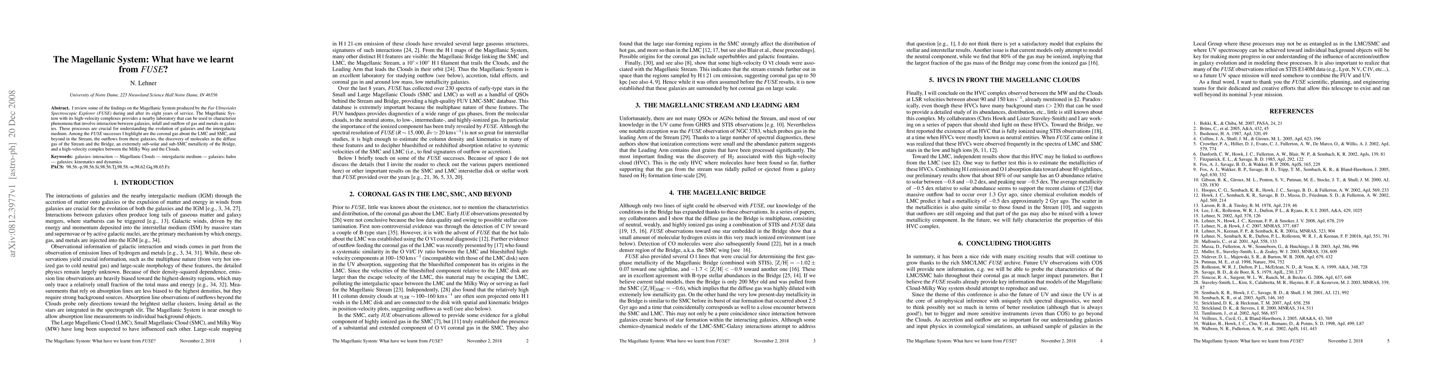 The FUSE mission provided significant insights into the Magellanic System, revealing coronal gas around the Large and Small Magellanic Clouds, gas outflows, and molecular discoveries in the Stream and Bridge, along with a notably low metallicity in the Bridge. These findings enhance our understanding of galaxy interactions and the intergalactic medium.