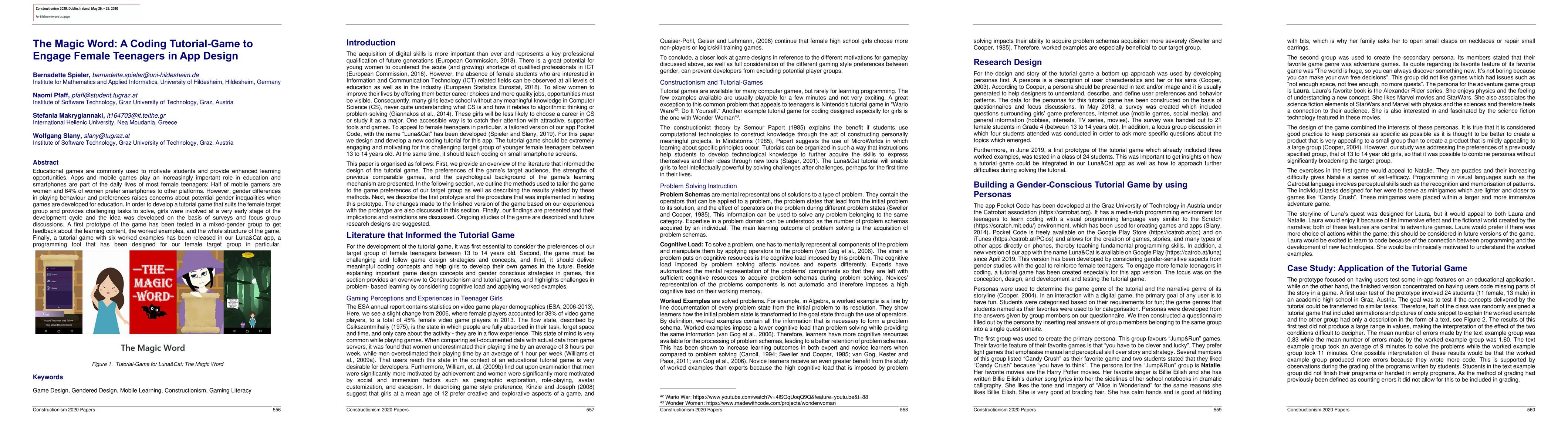 This research developed a coding tutorial-game, "The Magic Word," designed to engage female teenagers in app design, involving them early in the development cycle. A prototype was tested in a mixed-gender group for feedback, leading to the release of a final version in the Luna&Cat app, tailored to meet the preferences of the female target demographic.