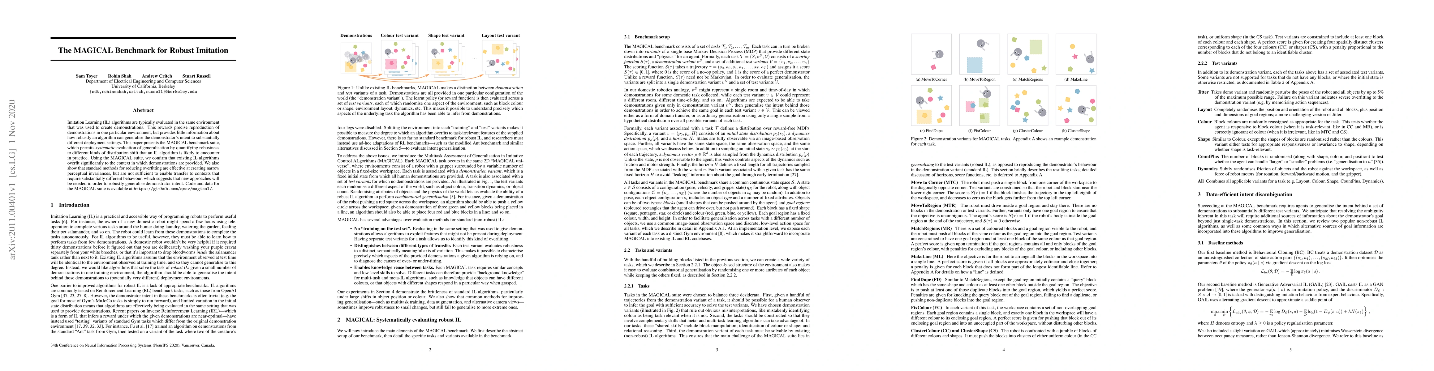 This paper introduces the MAGICAL benchmark suite for evaluating the generalisation capabilities of Imitation Learning algorithms, revealing significant overfitting to the demonstration environment. It highlights that existing methods only create narrow perceptual invariances, insufficient for substantial behavioural transfer, suggesting the need for new approaches to robustly generalise demonstrator intent.