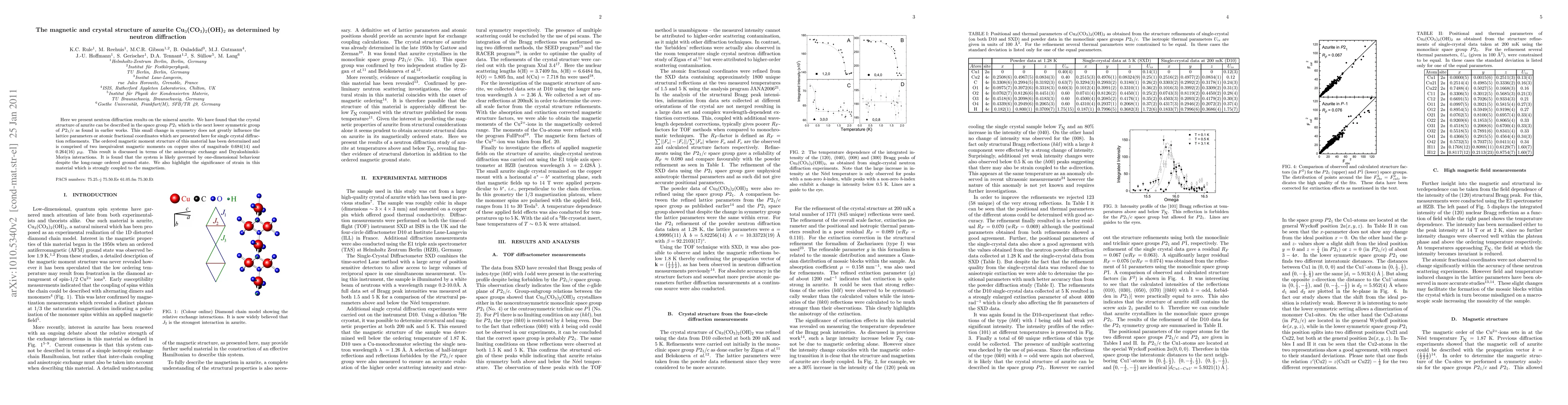 This study uses neutron diffraction to determine the crystal structure of azurite, finding it belongs to the $P2_1$ space group, with minor changes from previous $P2_1/c$ findings. The magnetic structure comprises two inequivalent magnetic moments on copper, indicating one-dimensional behavior despite long-range order, influenced by strain.