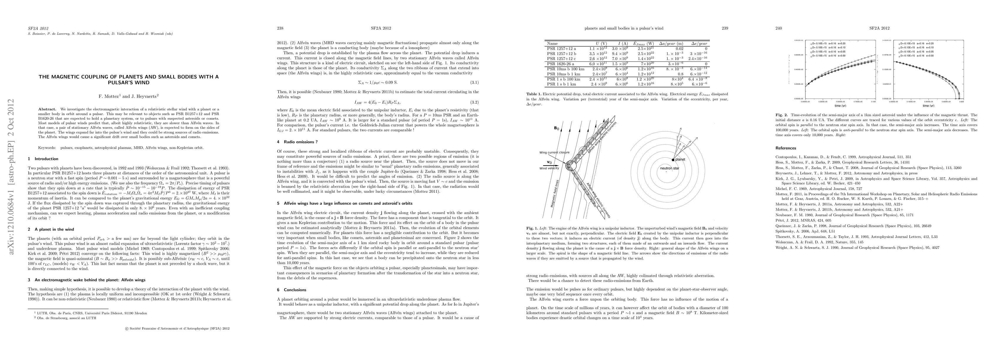 We investigate the electromagnetic interaction of a relativistic stellar wind with a planet or a smaller body in orbit around a pulsar. This may be relevant to objects such as PSR B1257+12 and PSR B1620-26 that are expected to hold a planetary system, or to pulsars with suspected asteroids or comets. Most models of pulsar winds predict that, albeit highly relativistic, they are slower than Alfv\'en waves. In that case, a pair of stationary Alfv\'en waves, called Alfv\'en wings (AW), is expected to form on the sides of the planet. The wings expand far into the pulsar's wind and they could be strong sources of radio emissions. The Alfv\'en wings would cause a significant drift over small bodies such as asteroids and comets.