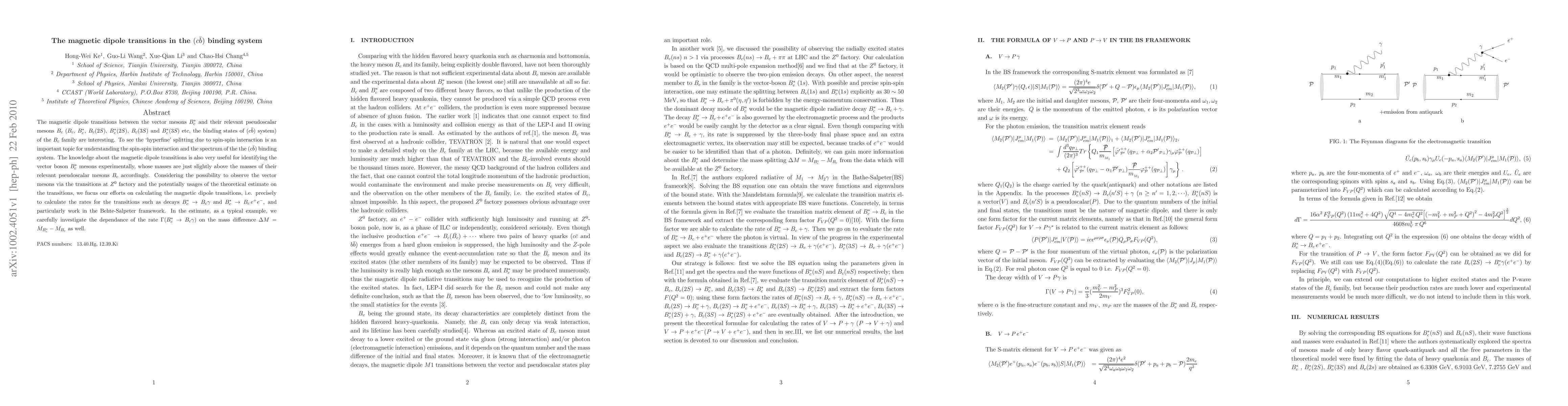 The magnetic dipole transitions between the vector mesons $B_c^*$ and their relevant pseudoscalar mesons $B_c$ ($B_c$, $B_c^*$, $B_c(2S)$, $B_c^*(2S)$, $B_c(3S)$ and $B_c^*(3S)$ etc, the binding states of $(c\bar{b})$ system) of the $B_c$ family are interesting. To see the `hyperfine' splitting due to spin-spin interaction is an important topic for understanding the spin-spin interaction and the spectrum of the the $(c\bar{b})$ binding system. The knowledge about the magnetic dipole transitions is also very useful for identifying the vector boson $B_c^*$ mesons experimentally, whose masses are just slightly above the masses of their relevant pseudoscalar mesons $B_c$ accordingly. Considering the possibility to observe the vector mesons via the transitions at $Z^0$ factory and the potentially usages of the theoretical estimate on the transitions, we fucus our efforts on calculating the magnetic dipole transitions, i.e. precisely to calculate the rates for the transitions such as decays $B_c^*\to B_c\gamma$ and $B_c^*\to B_c e^+e^-$, and particularly work in the Behte-Salpeter framework. In the estimate, as a typical example, we carefully investigate the dependance of the rate $\Gamma(B_c^*\to B_c\gamma)$ on the mass difference $\Delta M=M_{B_c^*}-M_{B_c}$ as well.