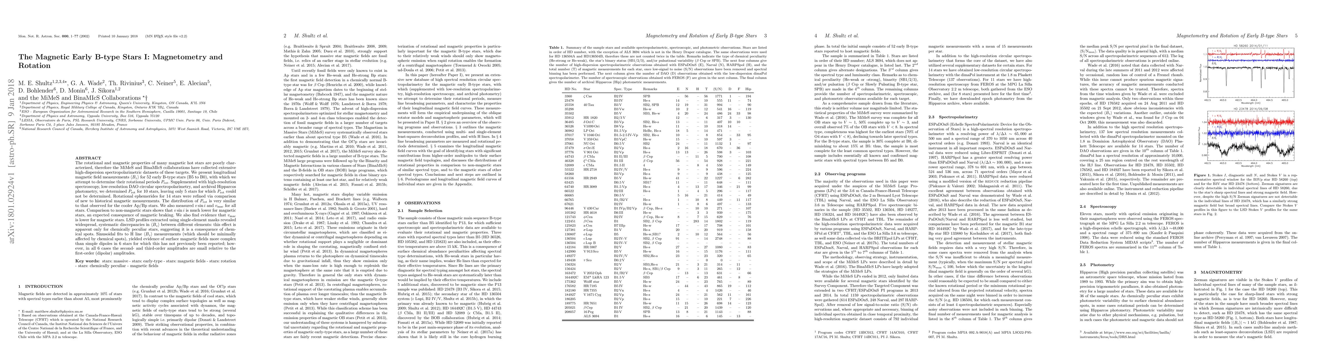 The rotational and magnetic properties of many magnetic hot stars are poorly characterized, therefore the MiMeS and BinaMIcS collaborations have collected extensive high-dispersion spectropolarimetric datasets of these targets. We present longitudinal magnetic field measurements $\langle B_{\rm z}\rangle$ for 52 early B-type stars (B5 to B0), with which we attempt to determine their rotational periods $P_{\rm rot}$. Supplemented with high-resolution spectroscopy, low-resolution DAO circular spectropolarimetry, and archival Hipparcos photometry, we determined $P_{\rm rot}$ for 10 stars, leaving only 5 stars for which $P_{\rm rot}$ could not be determined. Rotational ephemerides for 14 stars were refined via comparison of new to historical magnetic measurements. The distribution of $P_{\rm rot}$ is very similar to that observed for the cooler Ap/Bp stars. We also measured $v\sin{i}$ and $v_{\rm mac}$ for all stars. Comparison to non-magnetic stars shows that $v\sin{i}$ is much lower for magnetic stars, an expected consequence of magnetic braking. We also find evidence that $v_{\rm mac}$ is lower for magnetic stars. LSD profiles extracted using single-element masks revealed widespread, systematic discrepancies in $\langle B_{\rm z}\rangle$ between different elements: this effect is apparent only for chemically peculiar stars, suggesting it is a consequence of chemical spots. Sinusoidal fits to H line $\langle B_{\rm z}\rangle$ measurements (which should be minimally affected by chemical spots), yielded evidence of surface magnetic fields more complex than simple dipoles in 6 stars for which this has not previously been reported; however, in all 6 cases the second- and third-order amplitudes are small relative to the first-order (dipolar) amplitudes.